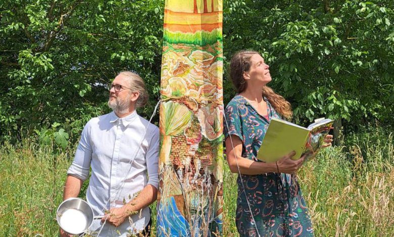 Oostwold – Marleen Dijkdrent (kunstenaar, afgestudeerd aan de WDKA in Rotterdam) onderzocht het Onder. Aards. Bestaan. en dat kreeg vorm in verschillende verticale objecten, gemaakt van biologisch afbreekbare materialen, die uitnodigen om verweven in te raken. Deze interactieve landschapskunst waarmee ze in de zomer van 2024 rond zal reizen is op 22 juni te zien bij Gastronomisch Voedselbos Oogstwold.