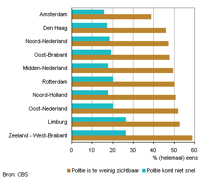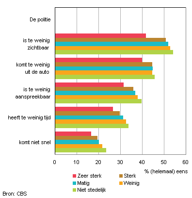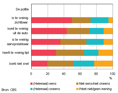 De helft van de Nederlanders van 15 jaar of ouder vond in 2013 dat de politie in de eigen woonbuurt ‘te weinig zichtbaar is’. Ook waren ongeveer vier op de tien mensen van mening dat de politie te weinig uit de auto komt of te weinig aanspreekbaar is. Een iets kleiner aandeel (30 procent) vond dat de politie te weinig tijd heeft. De snelheid waarmee de politie ter plekke is werd het positiefst beoordeeld, want met de stelling ‘de politie komt niet snel’ stemden met 20 procent de minste mensen in. Dit is ook de enige stelling waarmee meer mensen het oneens dan eens waren. Overigens had niet iedereen een uitgesproken oordeel over de politie. Het CBS heeft onlangs ook het vertrouwen van de burger in de politie onderzocht. Hieruit blijkt dat het vertrouwen in de Nederlandse politie groot is.