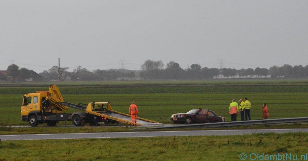 De auto is in de flauwe bocht die naar de A7 leidt van de weg geraakt. Dit is vermoedelijk gekomen in gladwegdek in samenwerking met onverwachte windstoten. De voertuig is inmiddels afgesleept. Het overig verkeer heeft door deze toedracht weinig hinder gehad.