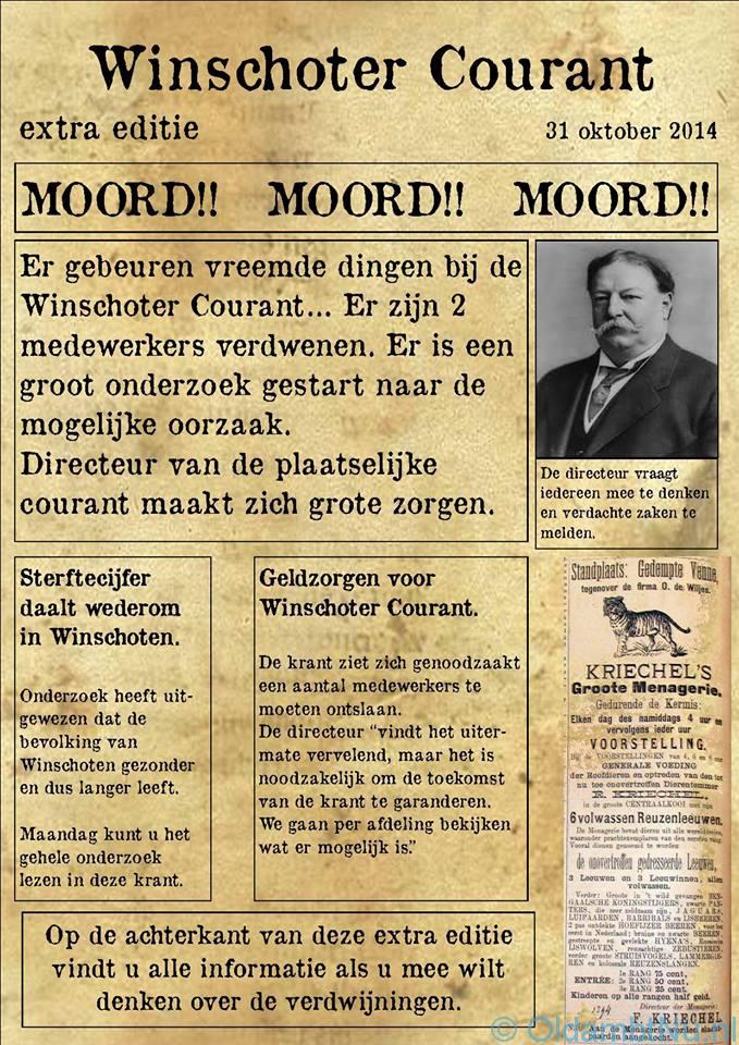 “Het mysterie van de Winschoter Courant” wordt georganiseerd door jongerencentrum ’t Spoor en Productiehuis de Jonge Westermannen. www.jctspoor.nl