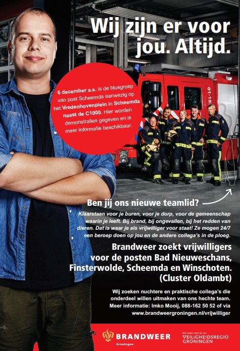 6 december a.s. is de blusgroep van de post Scheemda aanwezig van 10.00 tot 16.00 op het Vredenhovenplein in Scheemda naast de Jumbo (Oude C1000). Hier worden demonstraties gegeven en is meer informatie beschikbaar. Of kijk op www.brandweergroningen.nl/vrijwilliger