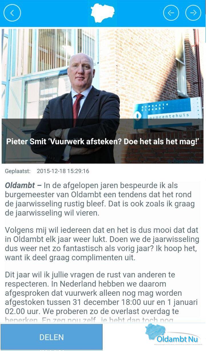 Door middel van een overzichtelijke nieuws overzicht ziet u in één oogopslag het laatste nieuws uit de gemeente Oldambt. U kunt vervolgens op het bericht klikken om verder te lezen. Mocht u het bericht leuk vinden en wilt u dit delen met uw kenniskring kunt u het artikel makkelijk delen via de ‘deel knop’ onderin het scherm.