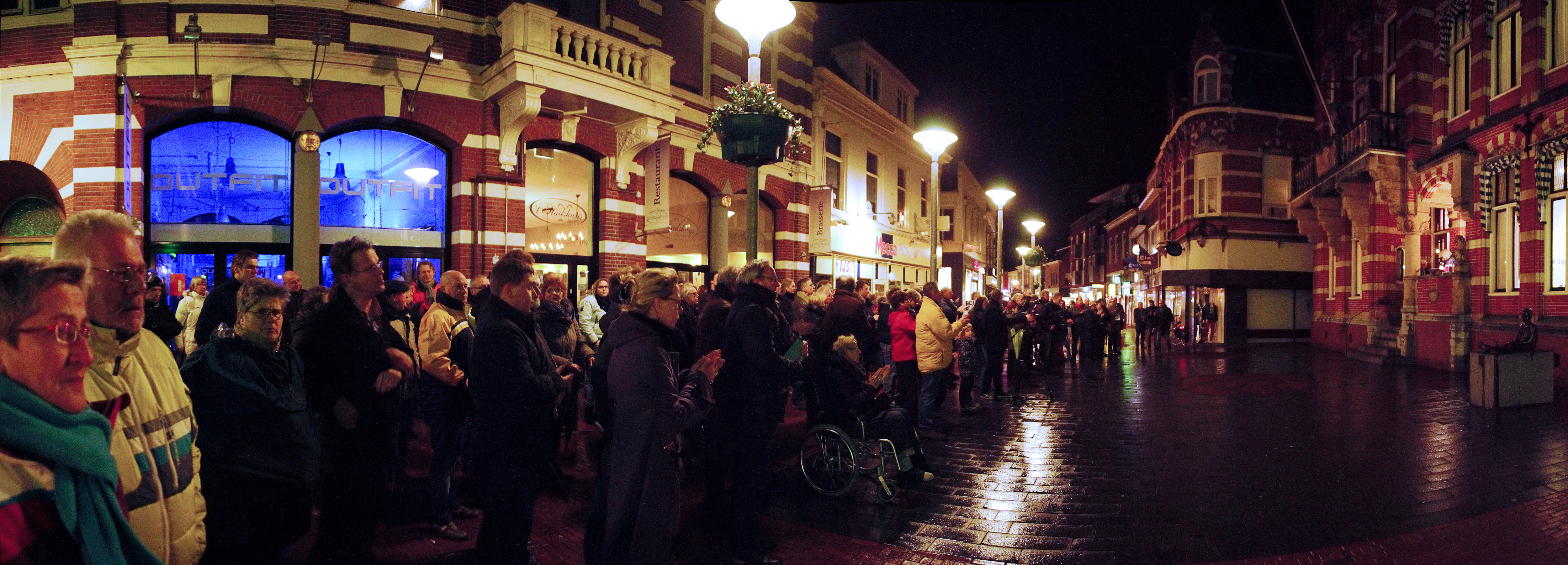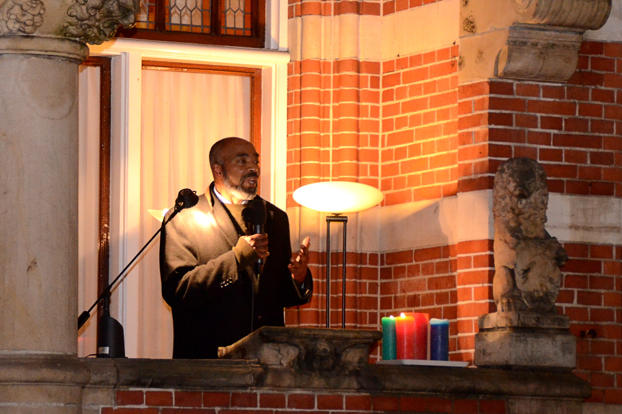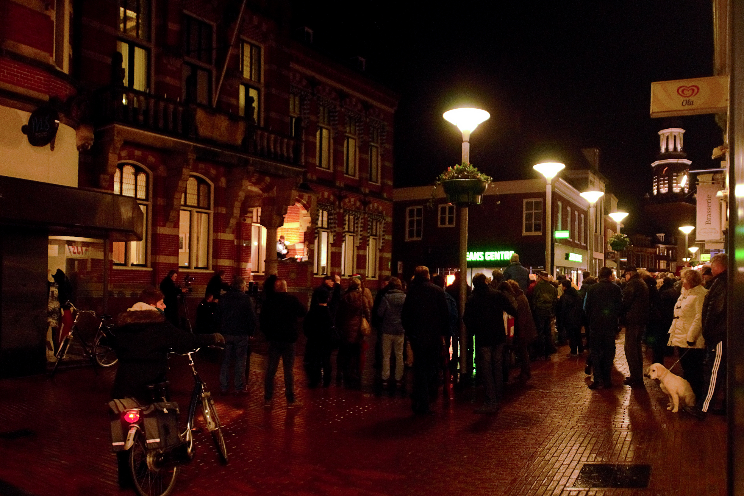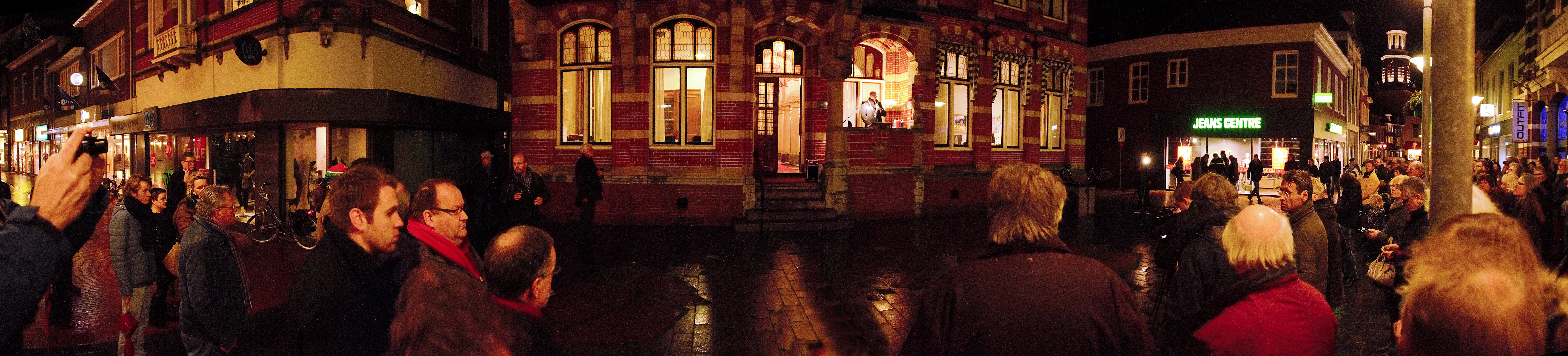 Vanaf het bordes sprak de burgemeester om 18.00 uur de mensen toe met een indrukwekkende speech. (Lees hier de Speech van Pieter Smit) Ook Imam Ahmed van de islamitische organisatie deed dit op zijn beurt. Ook werd er een minuut stilte gehouden voor de 12 doden. Dit ook in het belang van de vrijheid en meningsuiting.