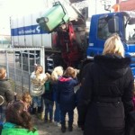 De chauffeur liet aan de kinderen zien hoe de vele containers worden geleegd, op een camerascherm in de cabine konden de kinderen meekijken en een indruk kijken hoe proces in de vrachtauto verloopt.