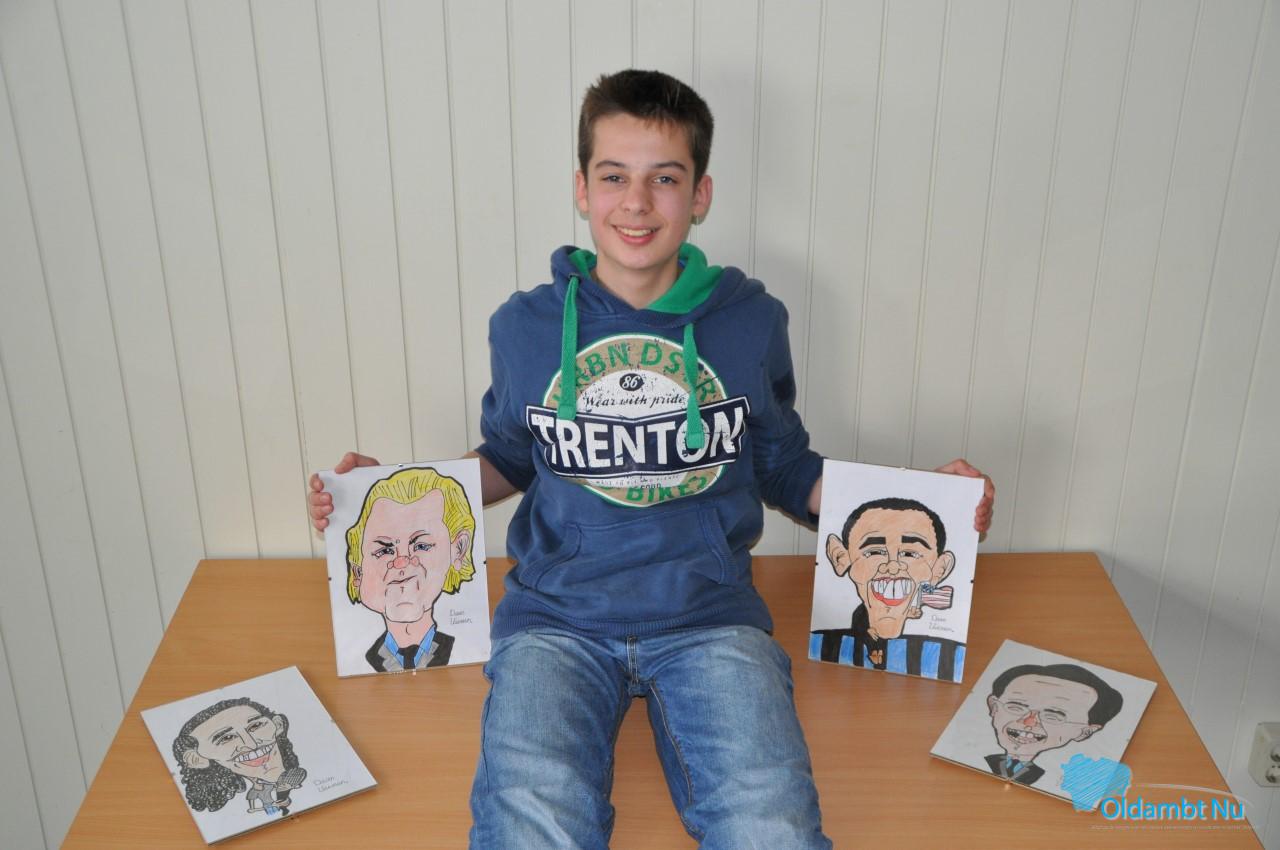 Daan Vaessen, leerling uit de tweede klas kb (kaderberoeps) van vestiging Bellingwedde, doet ook mee aan het Concours Culturel in de categorie design. Daan heeft vier karikaturen gemaakt van de bekendheden Alie B, Geert Wilders, Barack Obama en Mark Rutte. “Als de ogen herkenbaar zijn heb je een goede karikatuur” laat Daan weten. Hij past met zijn karikaturen helemaal bij het thema: n(i)et echt.