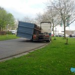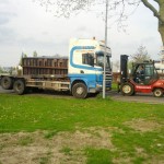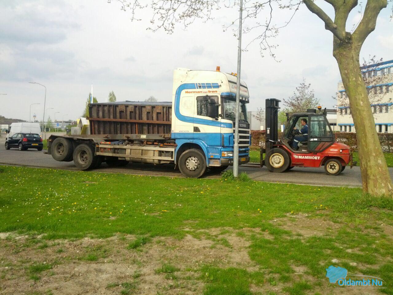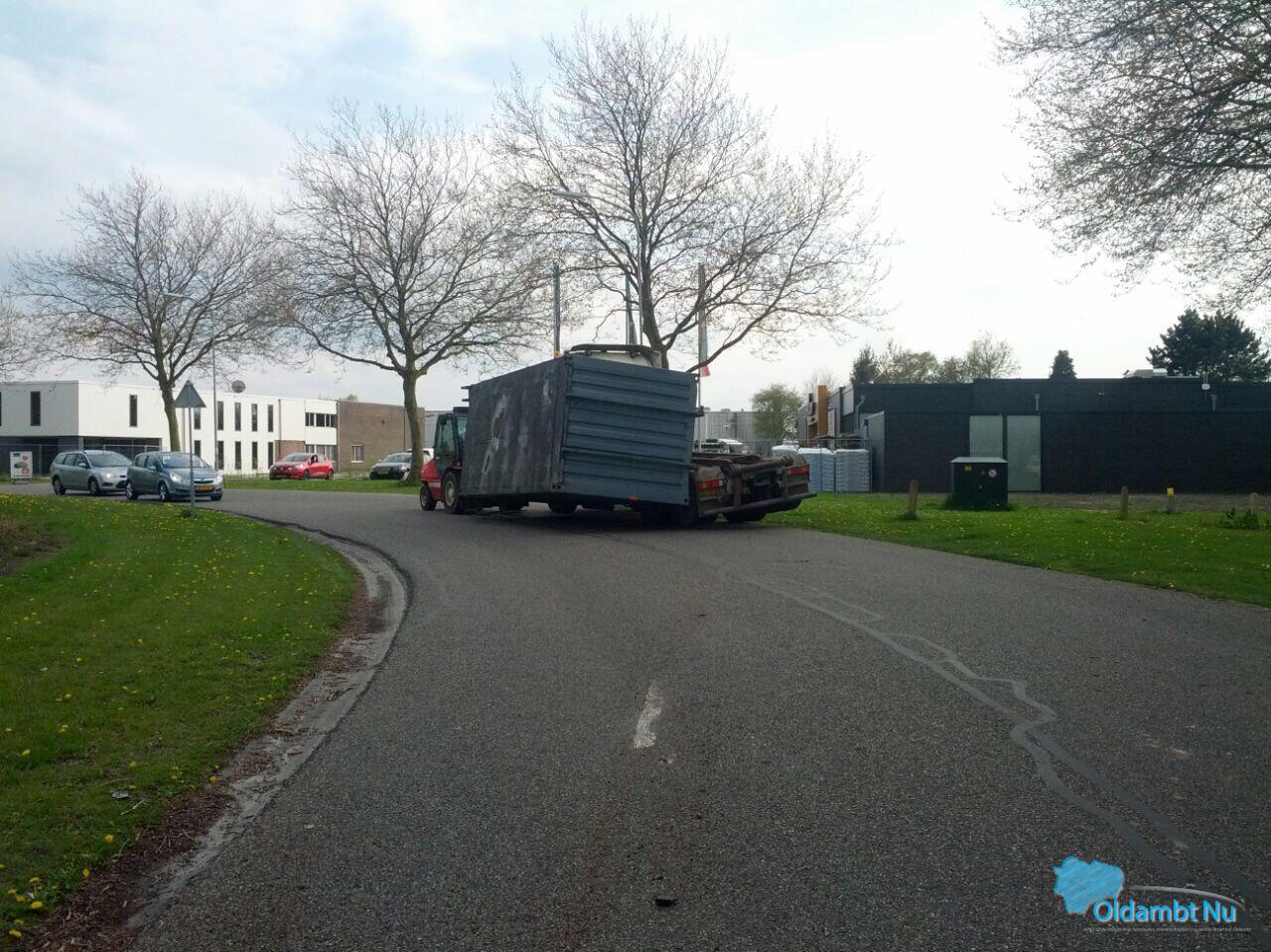 Het bedrijf heeft zelf de container weer rechtop de vrachtwagen weten te krijgen doormiddel van een heftruck.