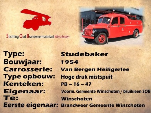 De Studebaker is in 1954 gebouwd bij de firma Van Bergen uit Heiligerlee. De auto heeft bij de brandweer Winschoten dienst gedraaid van 1954 tot 1974. Daarna is hij uitgeleend aan het brandweermuseum in Borculo. Tot maart 2013, toen hebben de leden van de SOB de inmiddels oldtimer terug gehaald naar zijn thuisbasis. Omdat de wagen zeer verouderd was en behoorlijk veel mankementen vertoonde, moest deze volledig gerestaureerd worden. Na maandenlang hieraan gewerkt te hebben is de auto weer zo goed als nieuw en toonbaar voor het publiek.