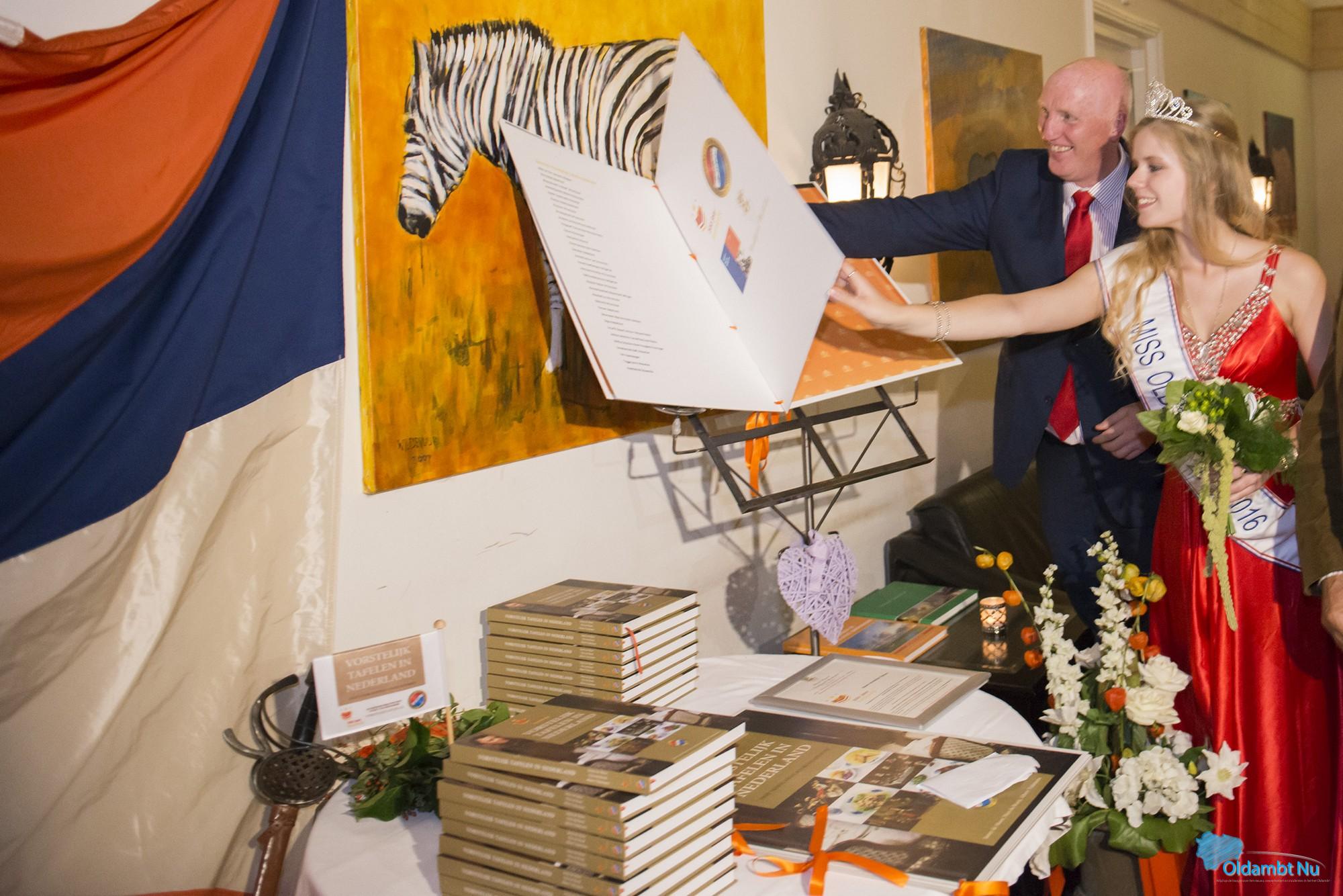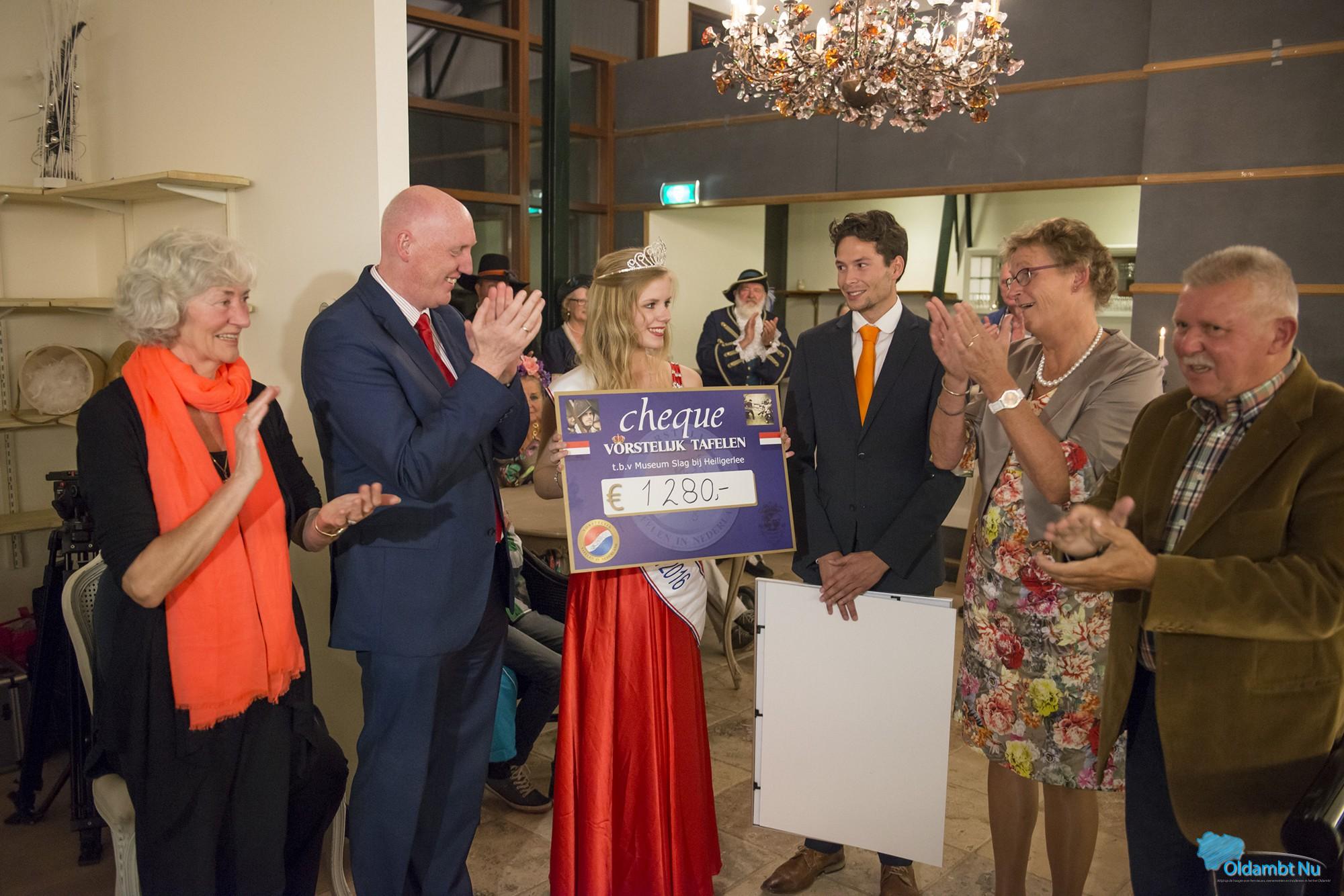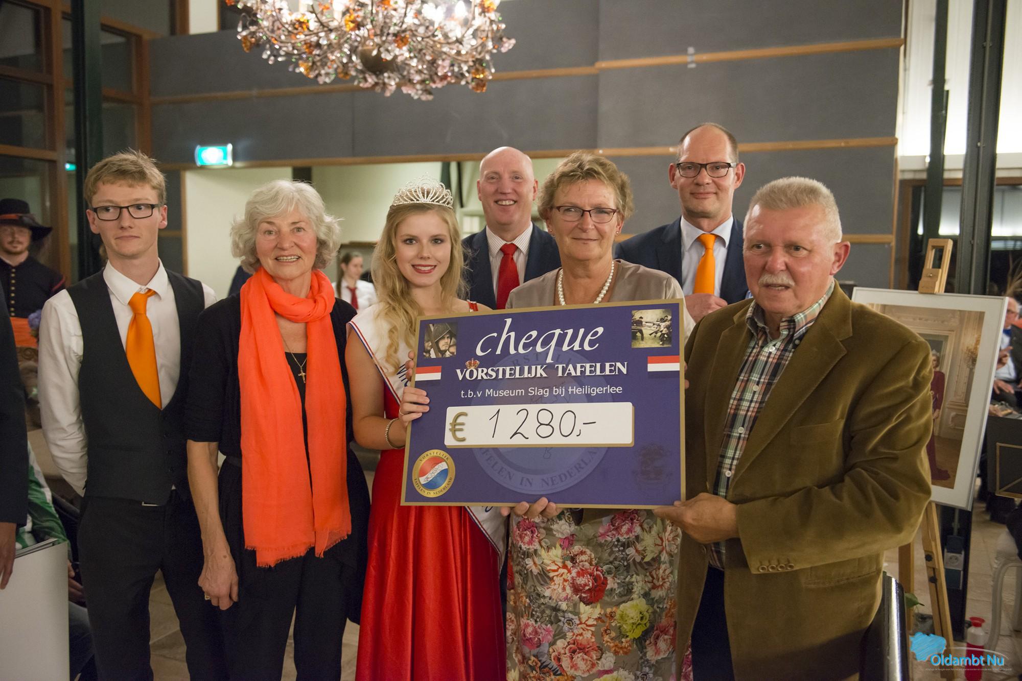Westerlee – Na een jaar lang Vorstelijk Tafelen Oldambt is op 24 september op het landgoed in Westerlee het project afgesloten met een bijzonder Koninklijk evenement. Na een Oranjeconcert, dat voor iedereen gratis toegankelijk was, werd het bedrag bekend gemaakt dat was opgehaald voor de musea in Heiligerlee. Miss Oldambt mocht het bedrag van 1280 Euro invullen op de cheque die ze vervolgens samen met burgemeester Pieter Smit overhandigde.