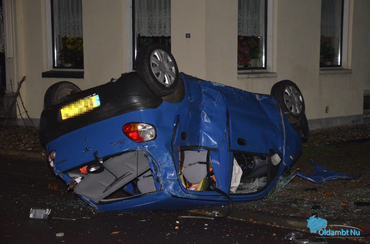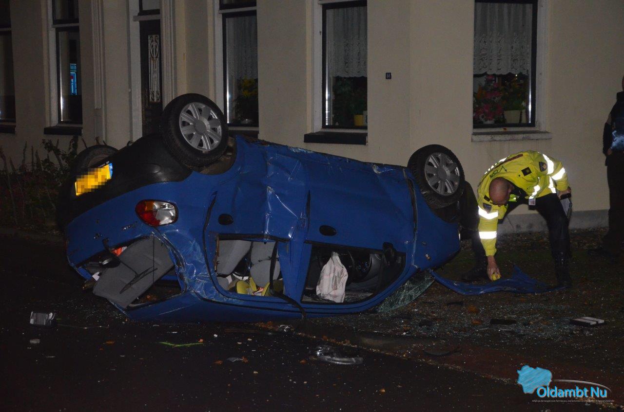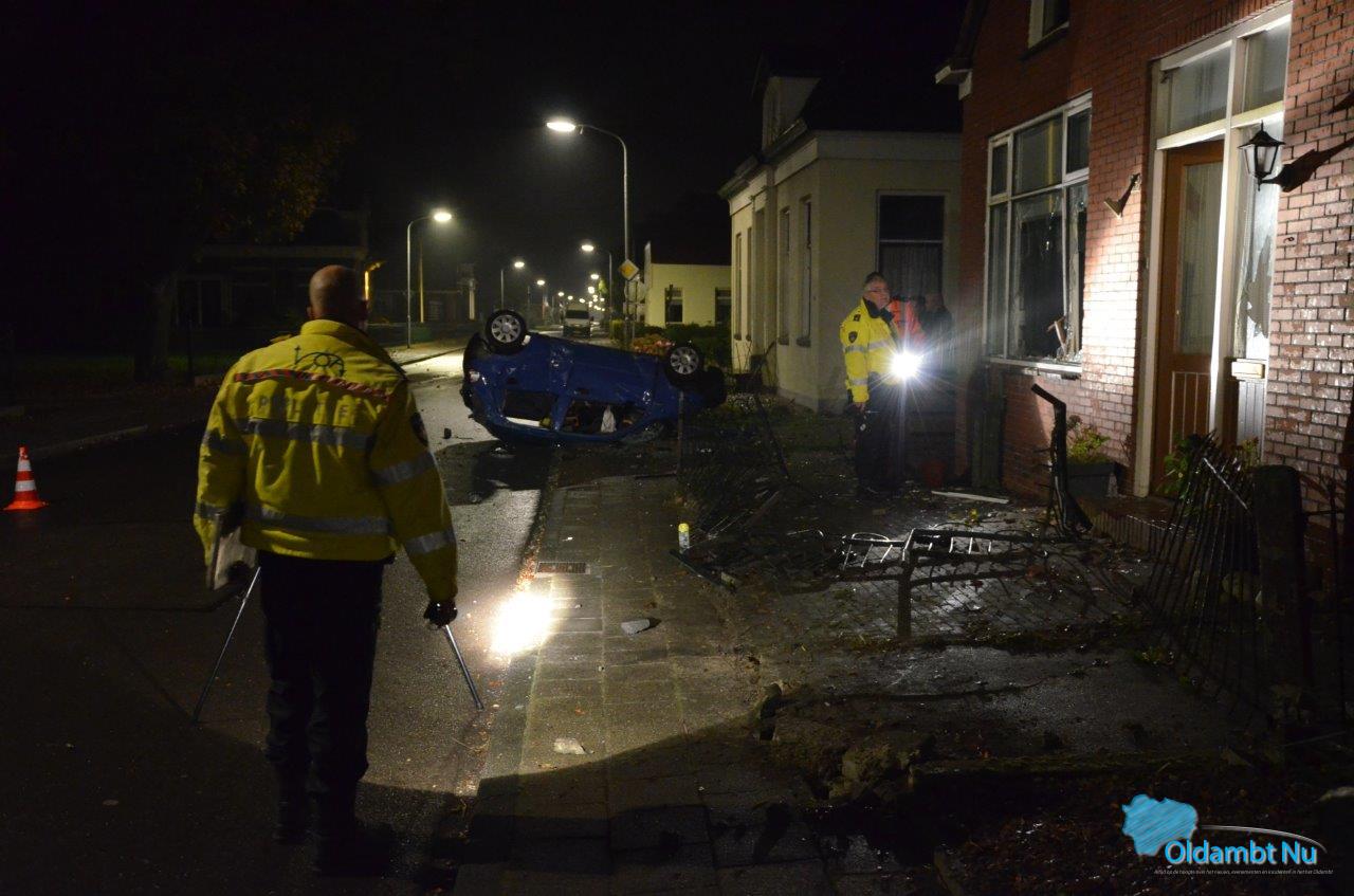 Ze botste tegen een hekwerk waarna ze met haar wagen werd gelanceerd. De auto schampte de woning. Meters verder kwam de wagen op de kop tot stilstand.