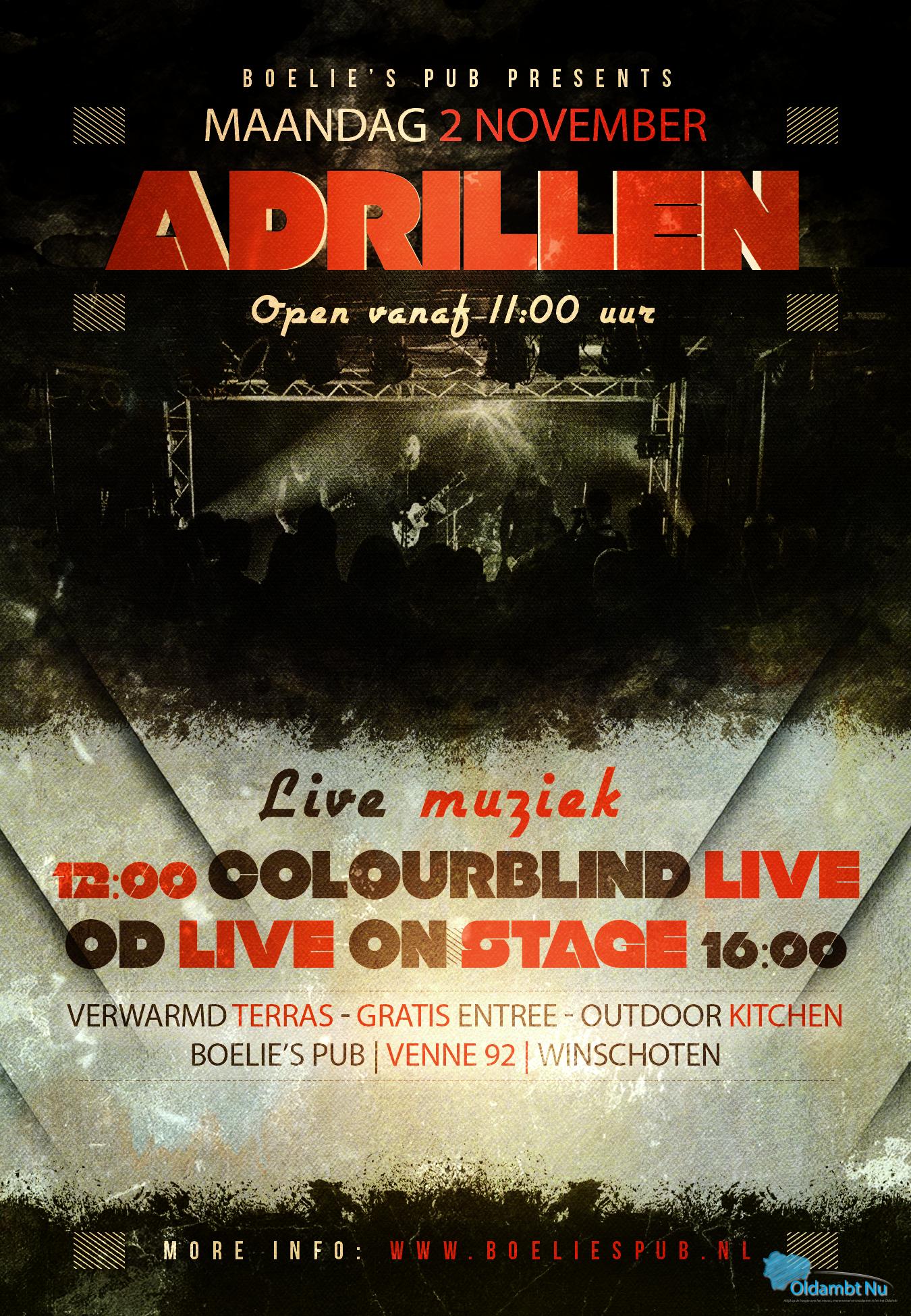 Dan gaan vanaf 16.00 uur de deuren open van de zaal van Boelie’s Pub en gaan we de Adrillen afsluiten met een knallend optreden van de coverband O.D.. O.D. is een coverband bestaande uit 6 gedreven muzikanten die het al meerder keren hebben gepresteerd om Boelie’s Pub volledig op de kop te zetten. De titels van de nummers die door de band gespeeld worden zullen door het publiek niet altijd direct herkend worden, doch bij de eerste tonen van het intro roept men vaak… O, Die!