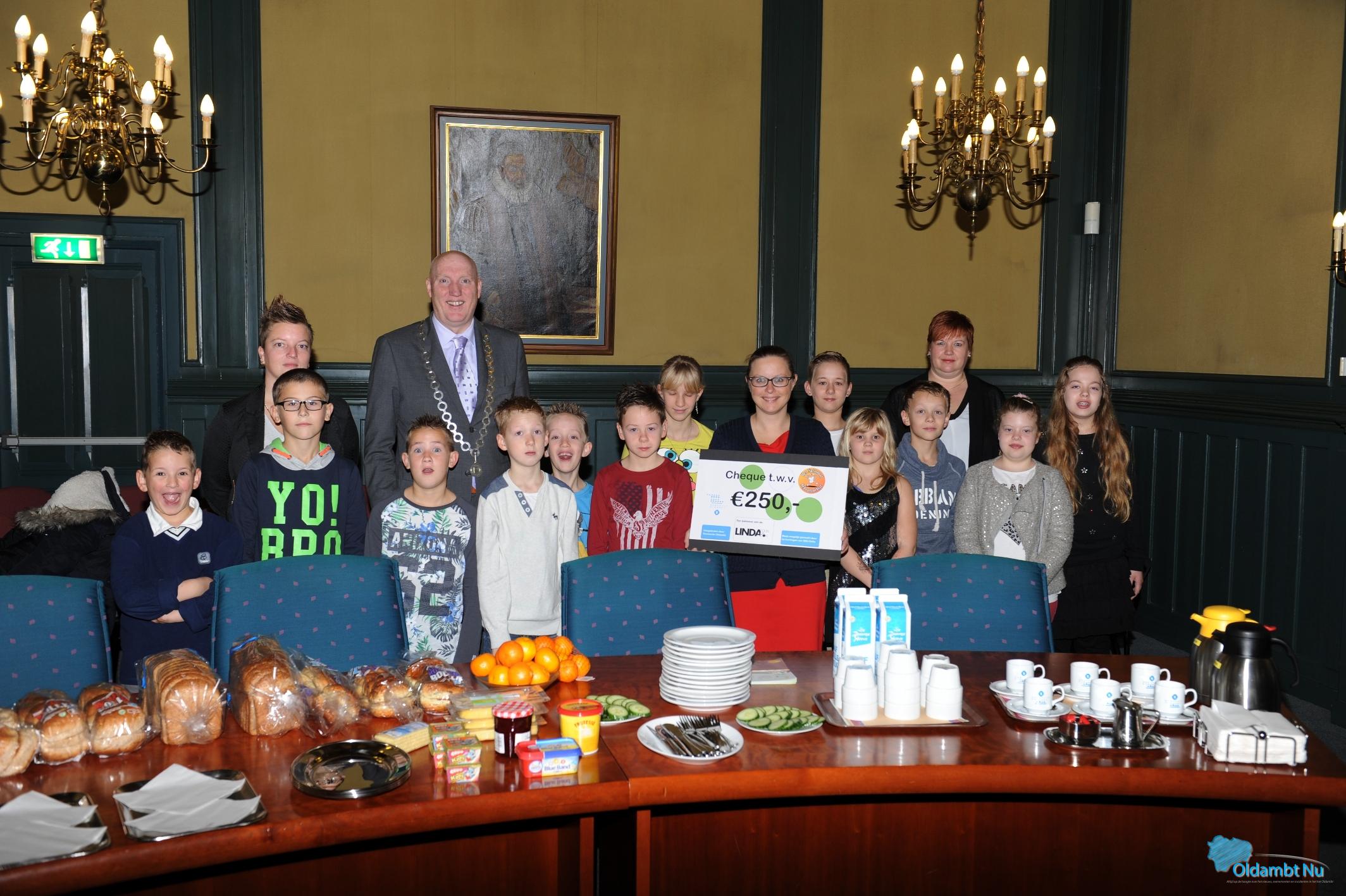 Aan het eind van het ontbijt betaalde burgemeester Pieter Smit symbolisch voor zijn ontbijtje met een donatie aan de LINDA.foundation. Dit jaar het goede doel van Het Nationaal Schoolontbijt. Deze stichting bezorgt jaarlijks meer dan 2.000 Nederlandse gezinnen met kinderen onder de armoedegrens een onvergetelijke decembermaand Dit door ze eenmalig een set cadeaukaarten te geven waarmee ze boodschappen, kleding en cadeautjes kunnen kopen. De leerlingen van SBO Delta namen de cheque met een bedrag van € 250,- in ontvangst. Burgemeester Pieter Smit en wethouder Laura Broekhuizen kijken met plezier terug op de bijzondere ontbijtontmoeting.