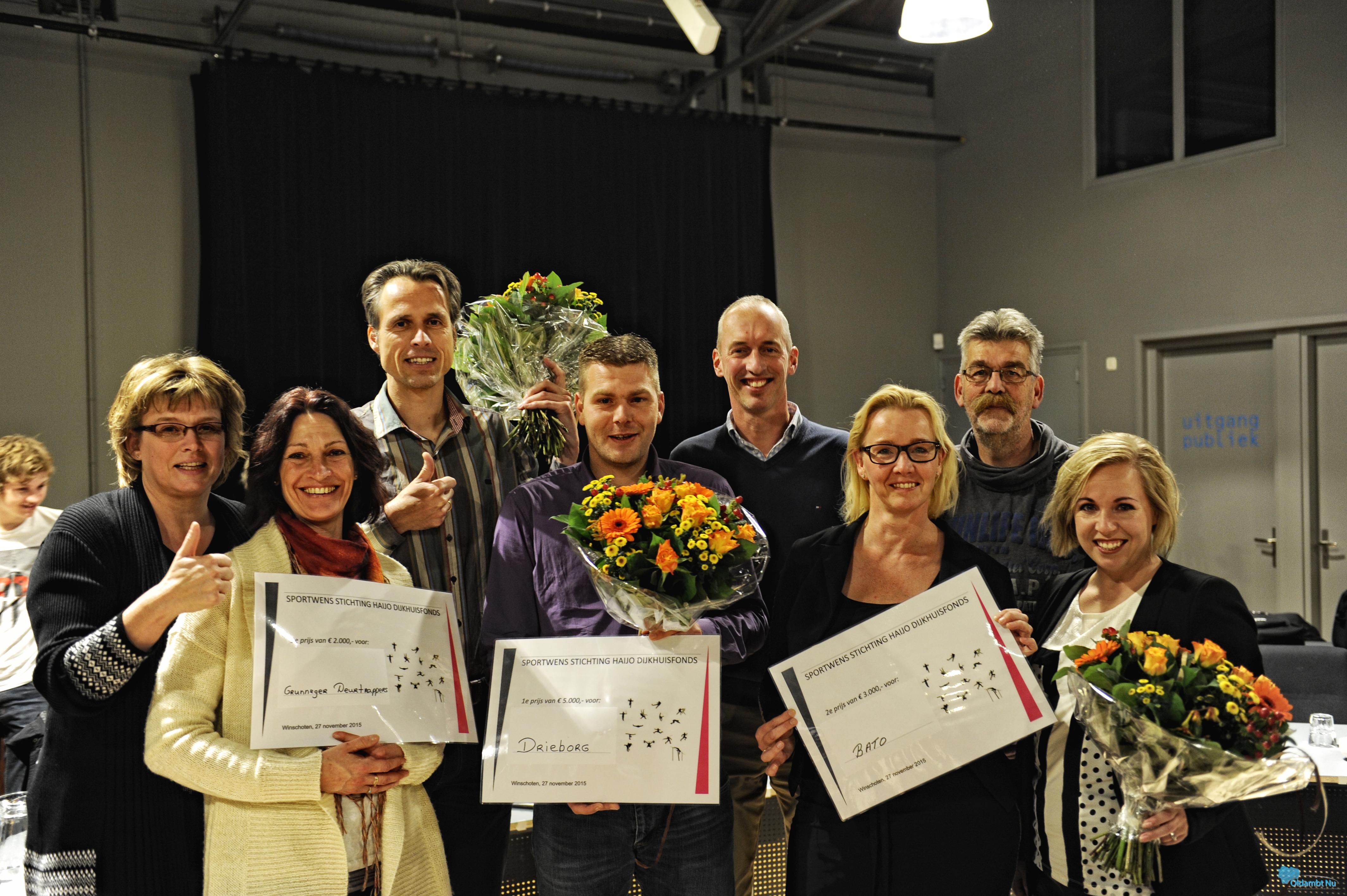 De 1ste plaats is gegaan naar Sportvereniging Drieborg, goed voor een bedrag van € 5.000,-. De jury complimenteerde hen met hun ondernemersmentaliteit, het denken in kansen en de breedte van hun sportvereniging: voetbal, volleybal en gymnastiek. De 2de plaats met een bedrag van € 3.000 werd in de wacht gesleept door gymnastiekverenging Bato met hun mogelijkheden tot sporten van heel jong tot heel oud. De 3de prijswinnaar, de Grunneger Deurtrappers, neemt een bedrag van € 2.000,- mee naar huis en organiseert tal van activiteiten ten behoeve van de strijd tegen kanker. Het totaalbedrag van – is beschikbaar gesteld vanuit het Haijo Dijkhuisfonds.