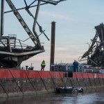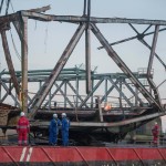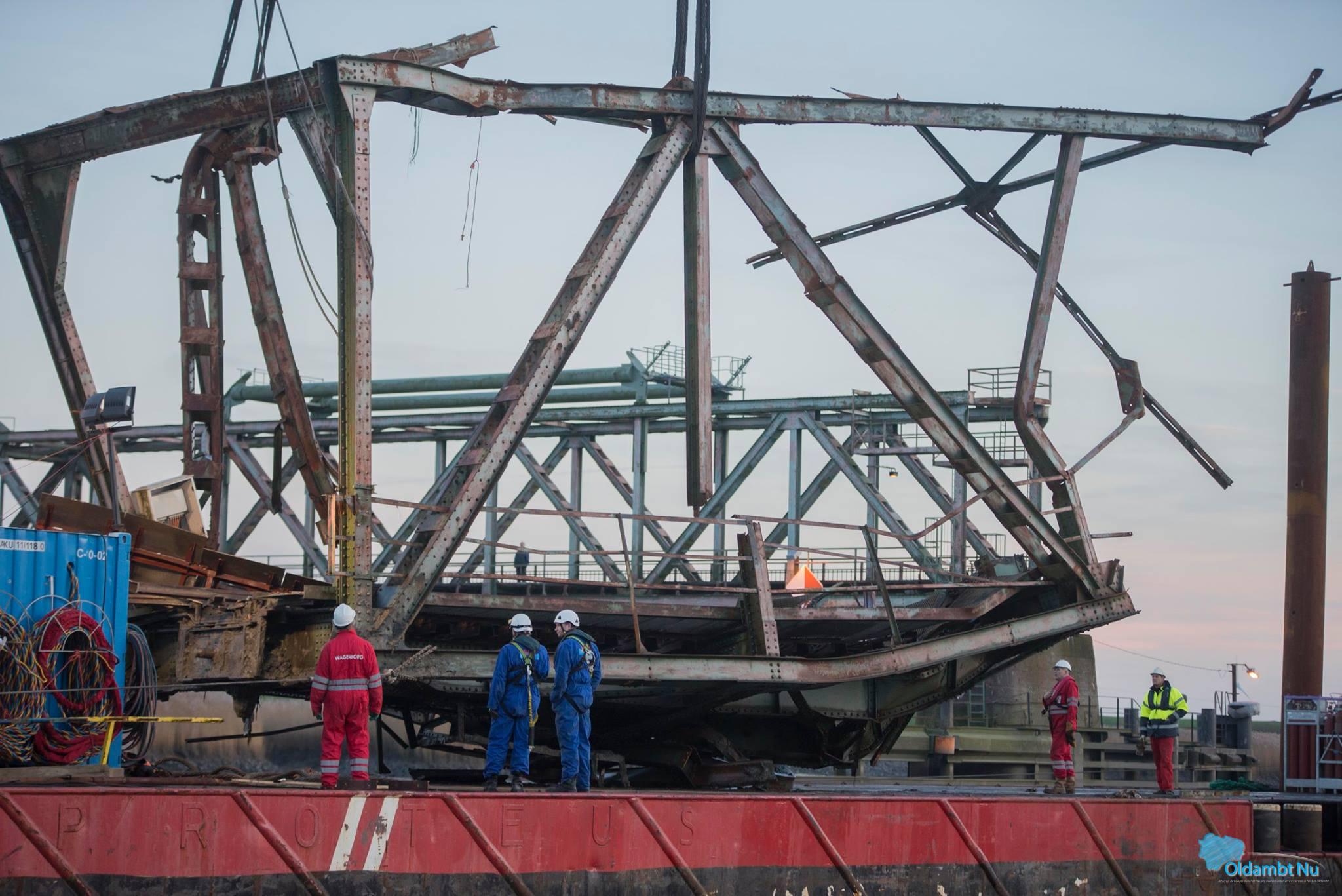 Weener – Rederij Wagenborg uit Delfzijl is dinsdag begonnen met het bergen van de kapotte spoorbrug bij Weener. Vorige week doorboorde een grote zeeschip van 112 meter de brug.