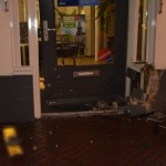 De voorkant van de auto raakte zwaar beschadigd. De deur van het kantoorpand is ontzet.