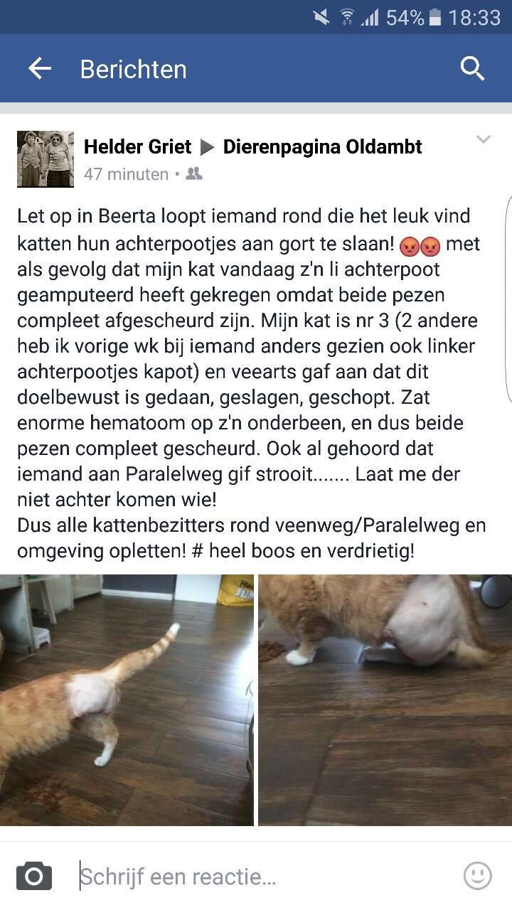 Helder Griet laat weten op Facebook: ‘Let op, in Beerta loopt iemand rond die het leuk vind katten hun achterpootjes aan gort te slaan, met als gevolg dat mijn kat zijn linkerpoot geamputeerd heeft gekregen.’