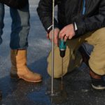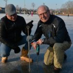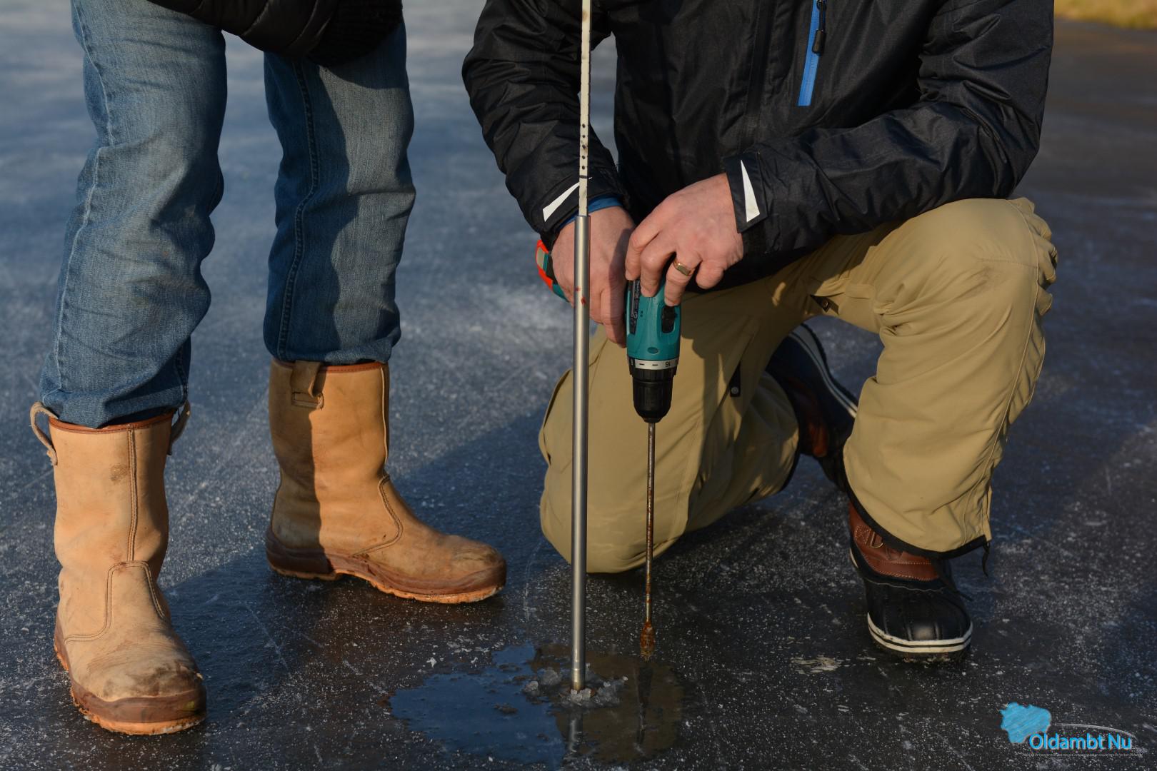 Scheemda – Zondagochtend 11:00 uur hebben de ijsmeesters van de ijsbaan aan de Pelmolenlaan in Scheemda het ijs vakkundig gemeten met een boor en een zelf gemaakte ijs-meter. Het ijs was ongeveer tussen de 6 en 7 centimeter. Dit is het minimale om er veilig op te kunnen schaatsen.