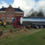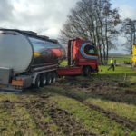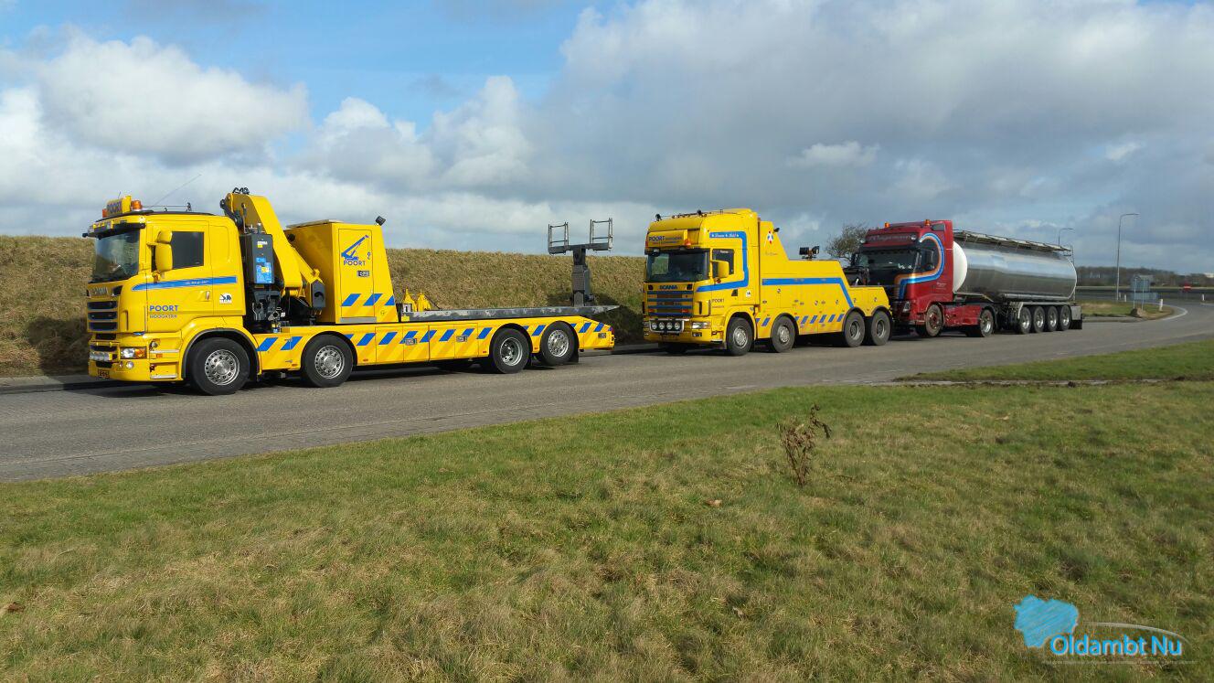 Midwolda – De combinatie die vanochtend rond 09:00 uur is geschaard op de Gereweg bij Midwolda is zojuist geborgen door bergingsbedrijf Poort uit Hoogkerk.