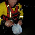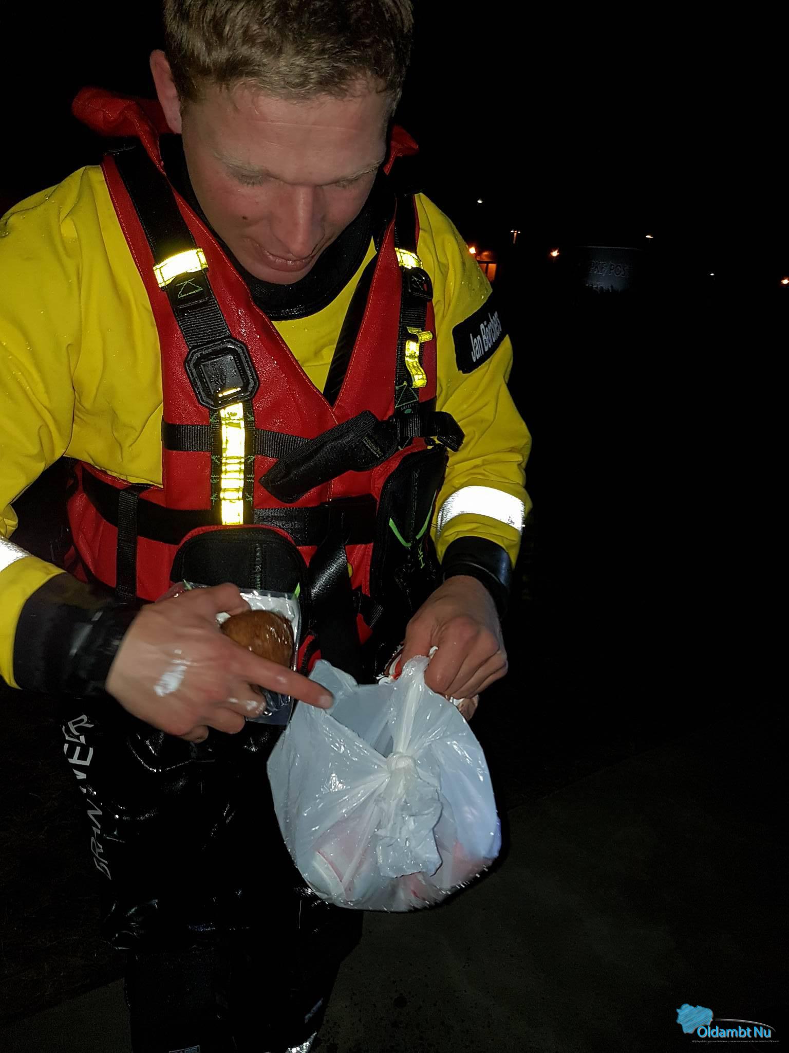 Totaal verrast is Jan met zijn collega’s ter plaatse gegaan om de slachtoffer uit zijn benarde positie te bevrijden. Toen Jan naar het slachtoffer gezwommen was bleek dat er een plastic zak naast dreef met een bepaalde inhoud erin. Nieuwsgierig geworden wat erin zat heeft hij ter plaatse bij het slachtoffer eerst de zak geopend en deed hier wel een heel opmerkelijke vondst: Een aantal gehaktballen met frisdrank en een zak borrelnoten, deze slachtoffer was wel heel erg op de hoogte van wat Jan vaak na een oefening nuttigt.