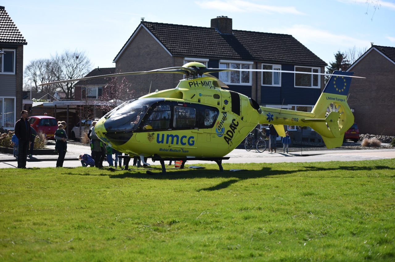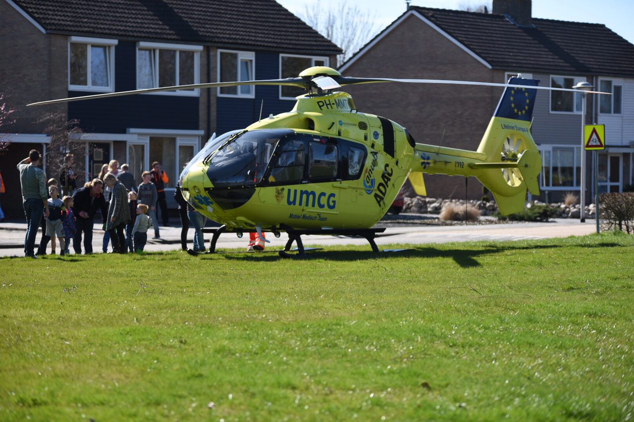 Nadat de piloot van de traumahelikopter een plekje had gezocht om te landen op een grasveldje aan de Krokusstraat in Scheemda, wist de trauma-arts zich snel te kunnen ontfermen over het slachtoffer.