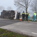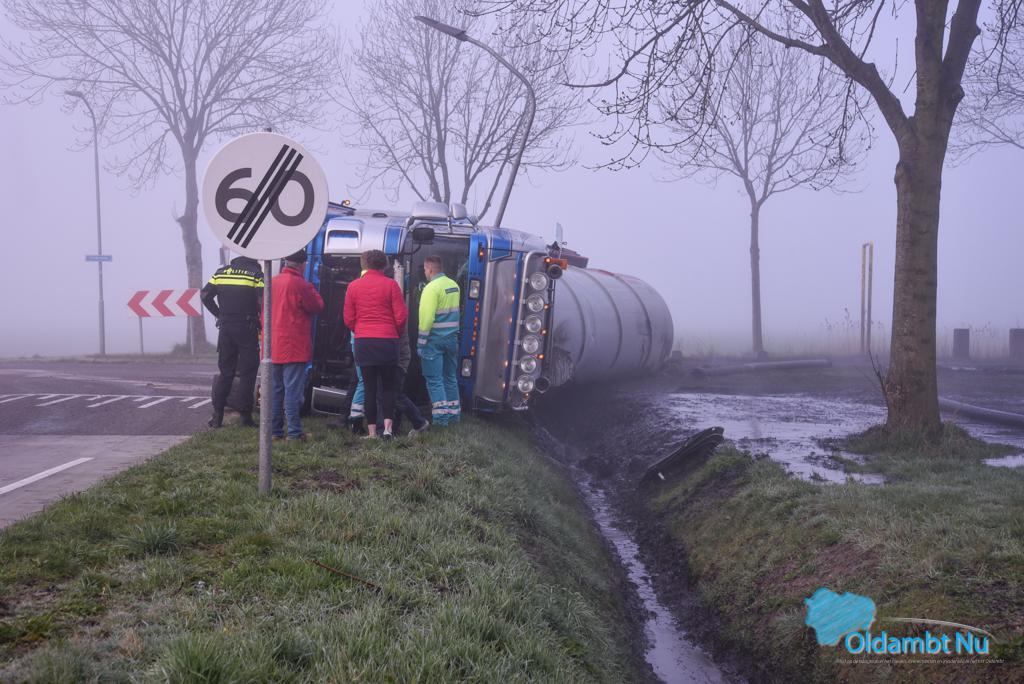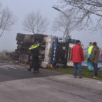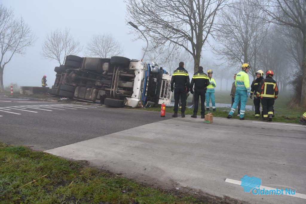 Beerta – Aan de Ulsderweg is maandagochtend door een nog onbekende oorzaak een vrachtwagen geladen met mest gekanteld.