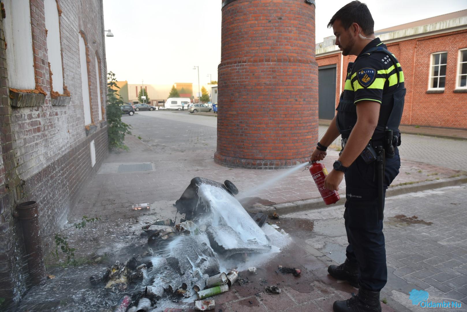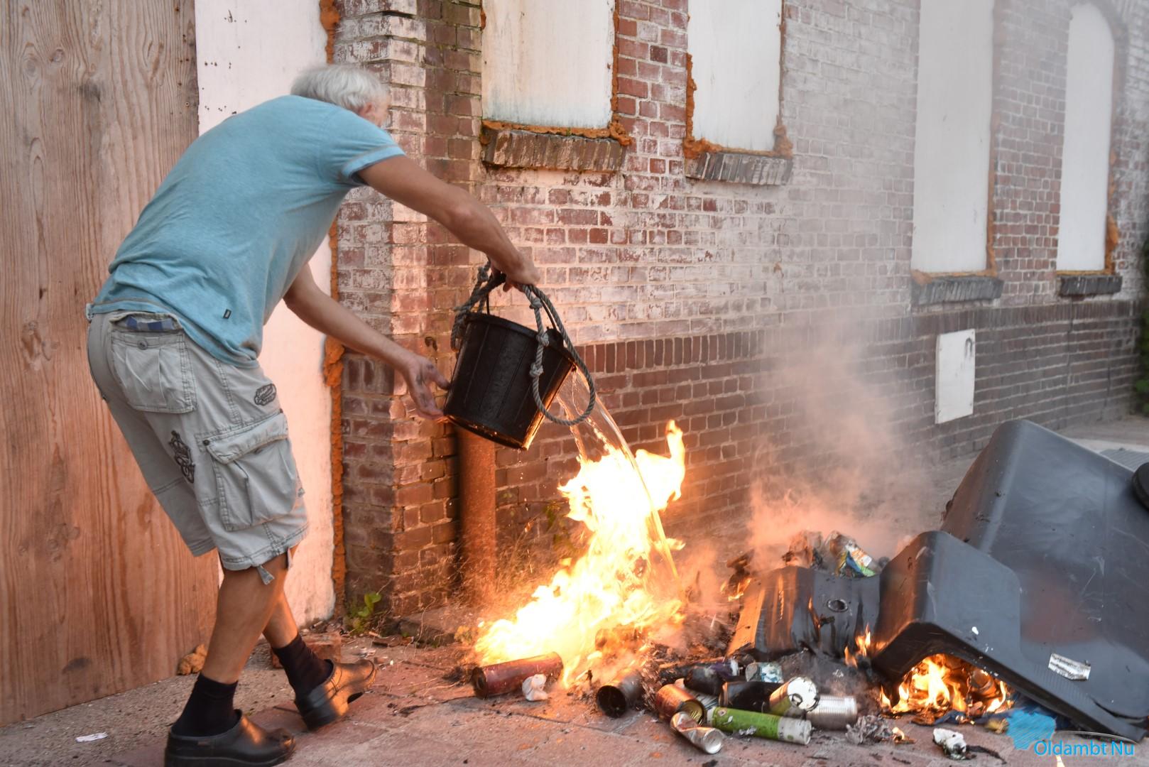 Buurtbewoner, politie en brandweer blussen afvalbrand