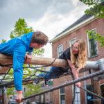 Niet alles verliep vlekkeloos: een moedig meisje raakte met haar haren verstrikt in de touwen tijdens het abseilen en kon zichzelf niet bevrijden. Gelukkig was de brandweer snel ter plaatse, en met behulp van een hoge ladder kon een brandweerman haar haren losmaken, waardoor ze veilig naar beneden kon komen.