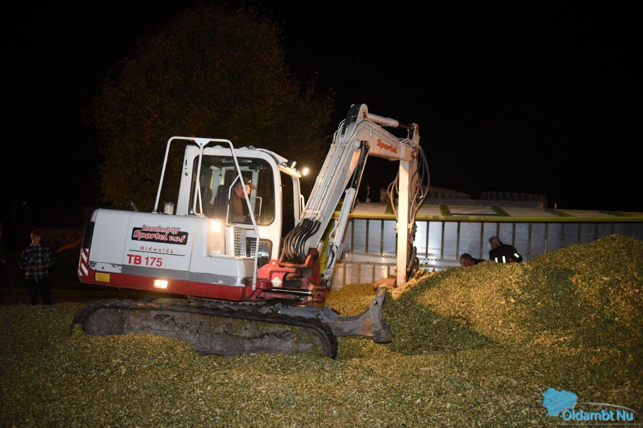 Een bergingsbedrijf komt ter plekke met een kraan om de silagewagen overeind te zetten. Tot die tijd is de weg afgesloten door de gemeente Oldambt.