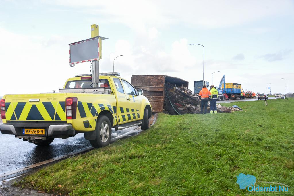 Een kraan van afvalverwerker Virol uit Scheemda heeft de container leeggehaald en het afval in een andere container gegooid. Tijdens deze werkzaamheden is de weg enige tijd afgesloten. “We hopen dat de weg om half 3 weer vrij is” aldus de persvoorlichter van Provincie Groningen Jan v/d Meide tegenover OldambtNu.nl.