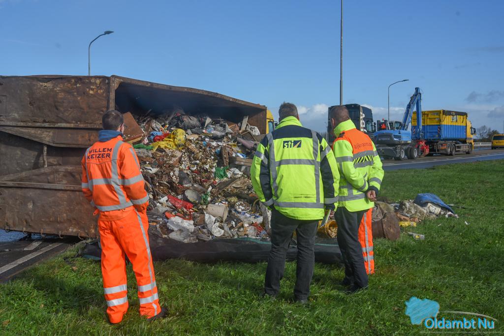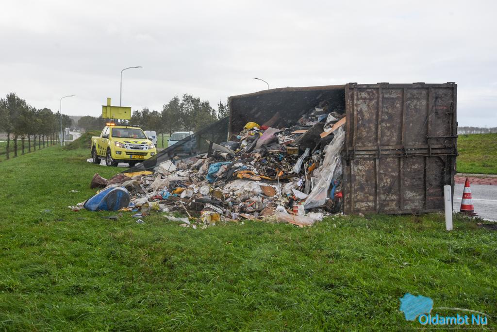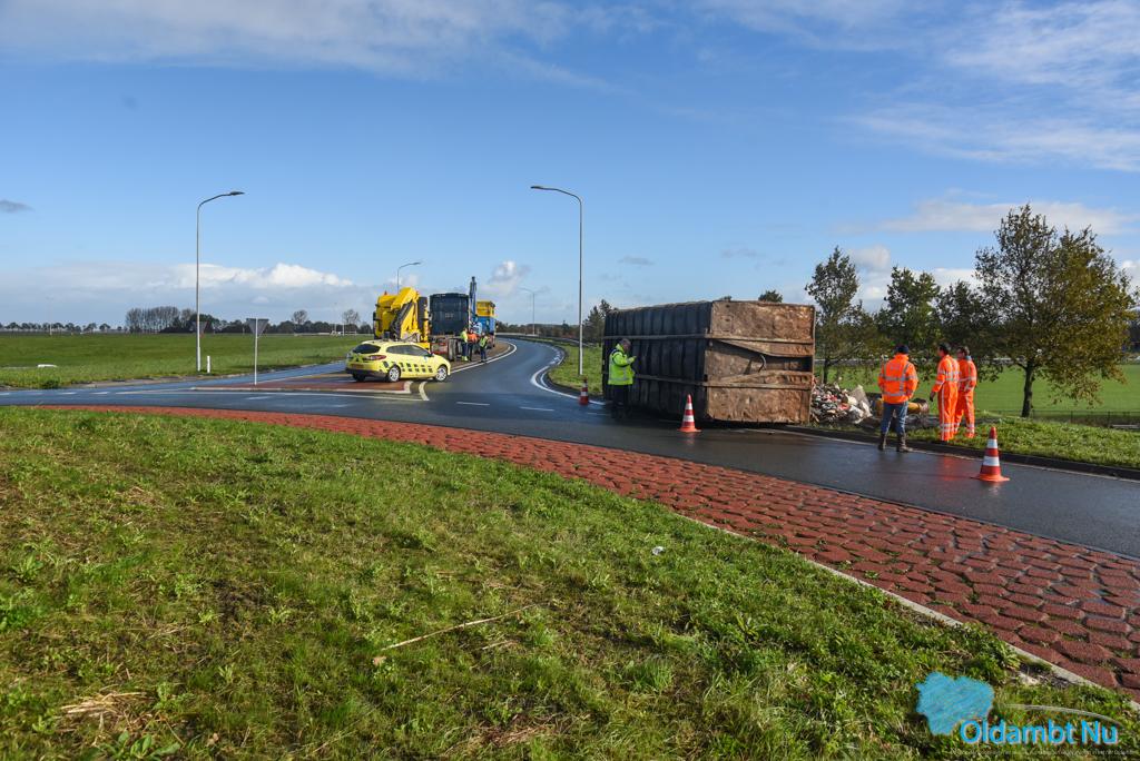 Scheemda – Door nog onbekende oorzaak is maandagochtend een container met afval van een vrachtwagen gevallen. Het incident gebeurde op de rotonde bij de op en afrit van de A7 bij Scheemda.