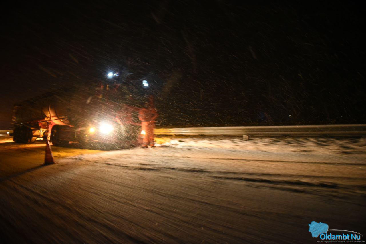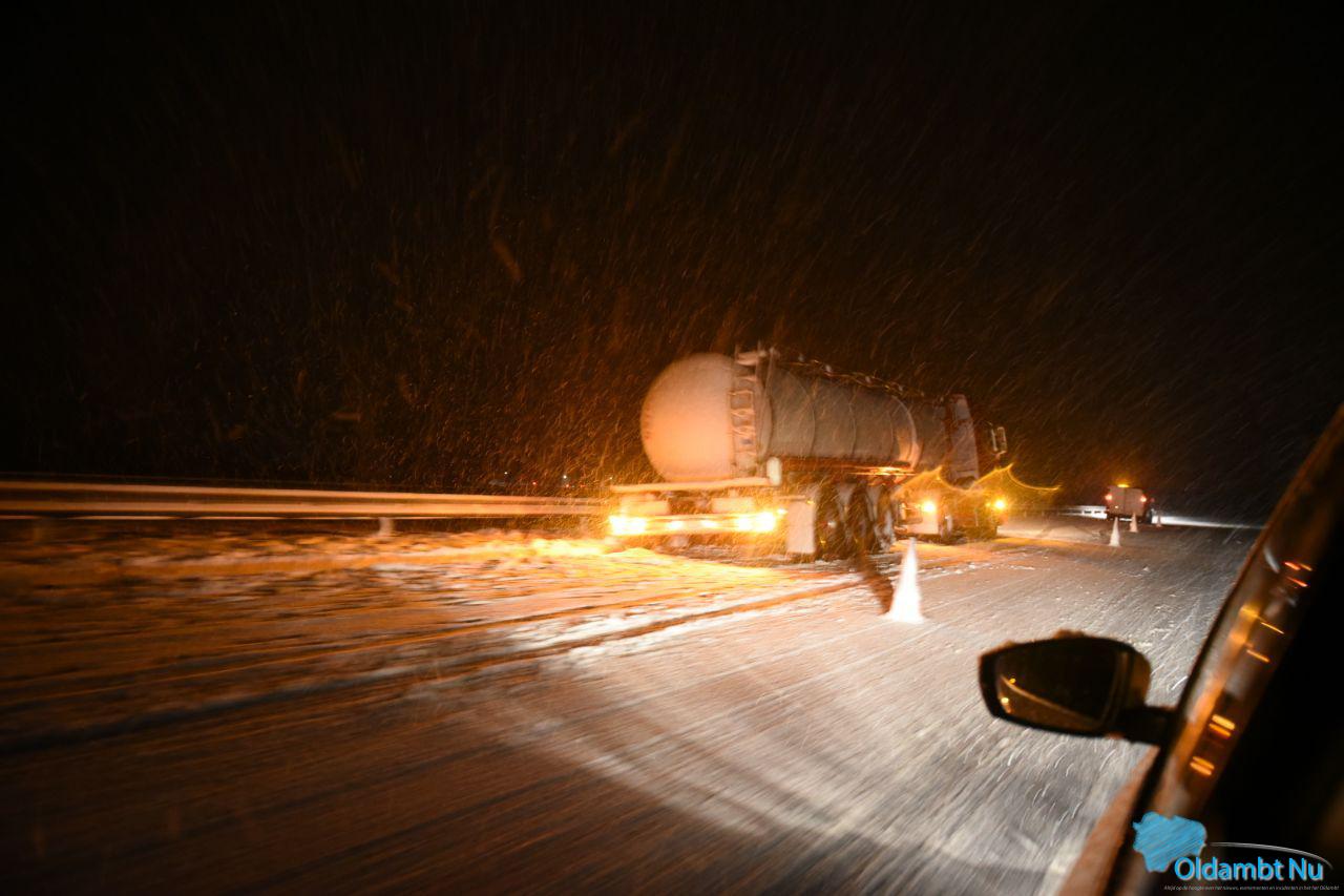 Vermoedelijk is de bestuurder met zijn combinatie door de gladheid van de rijbaan geraakt. Bij het ongeluk raakte voor zover bekend niemand gewond.
