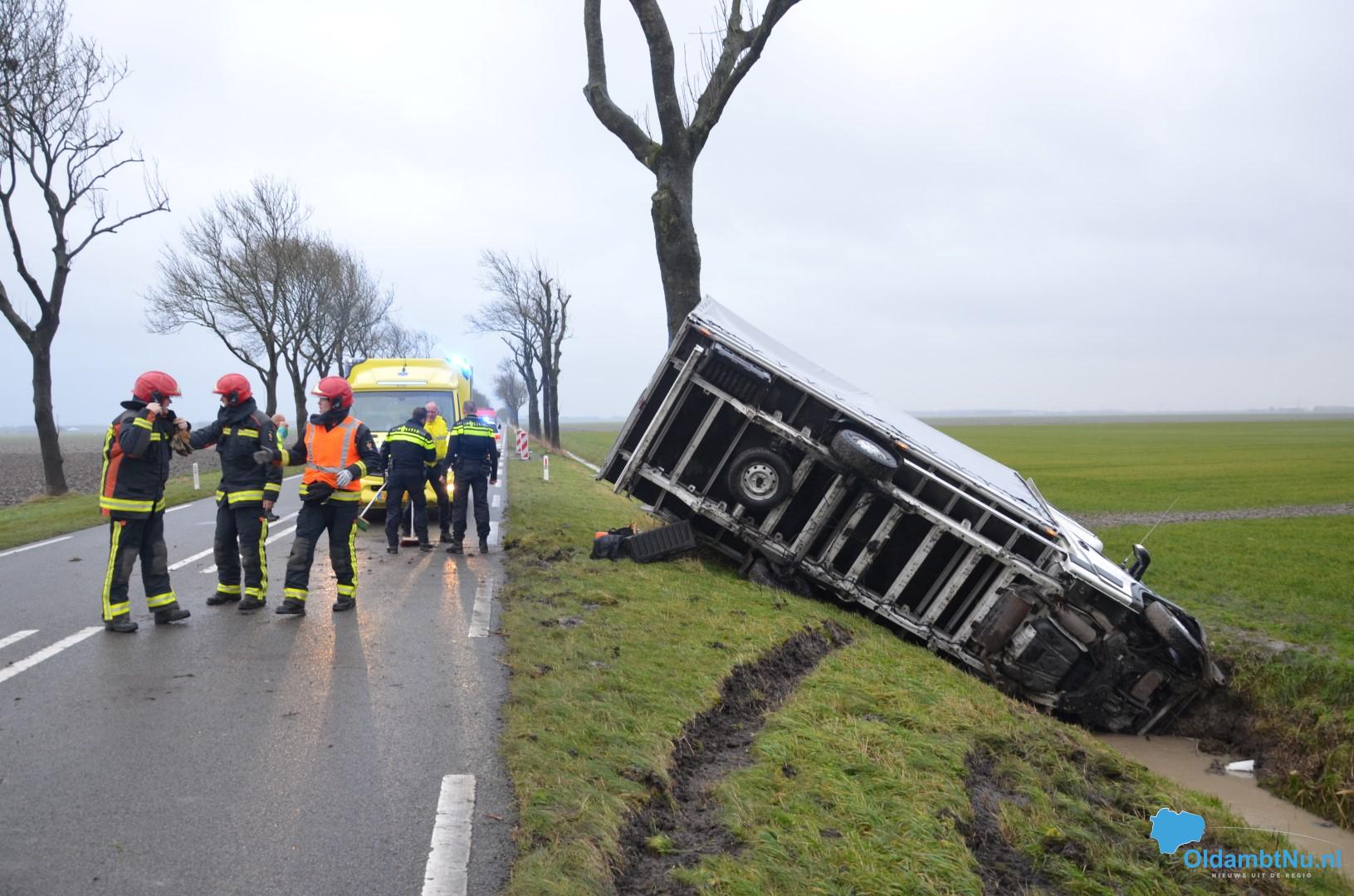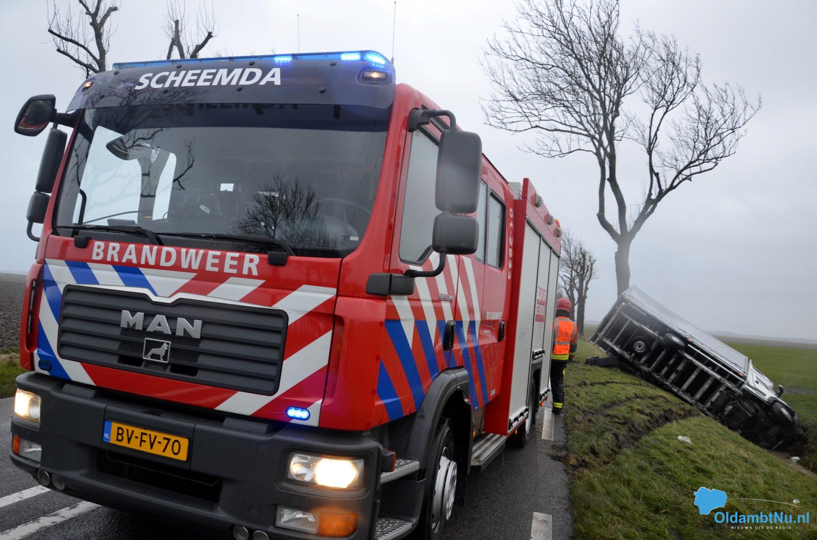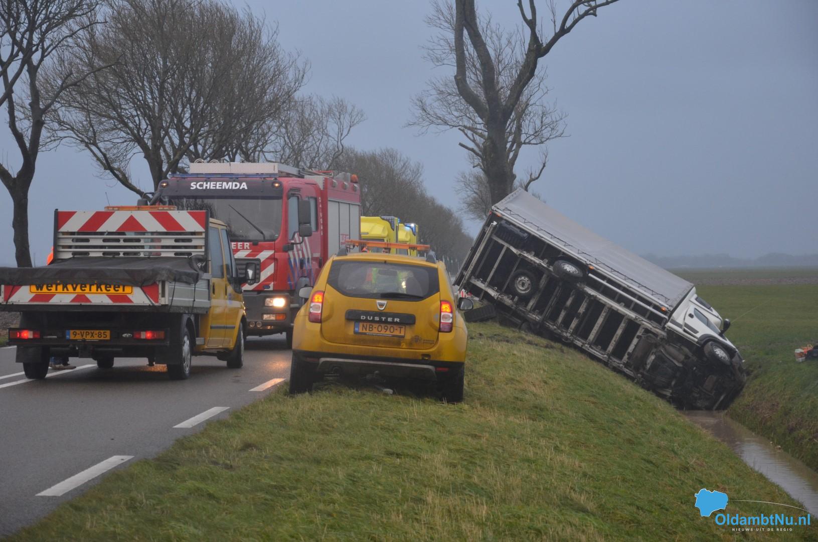 Nieuwolda – Op de N362 ook wel de Gereweg tussen Nieuwolda en Scheemda is woensdagmiddag een vrachtwagen door een storm in de sloot terecht gekomen.