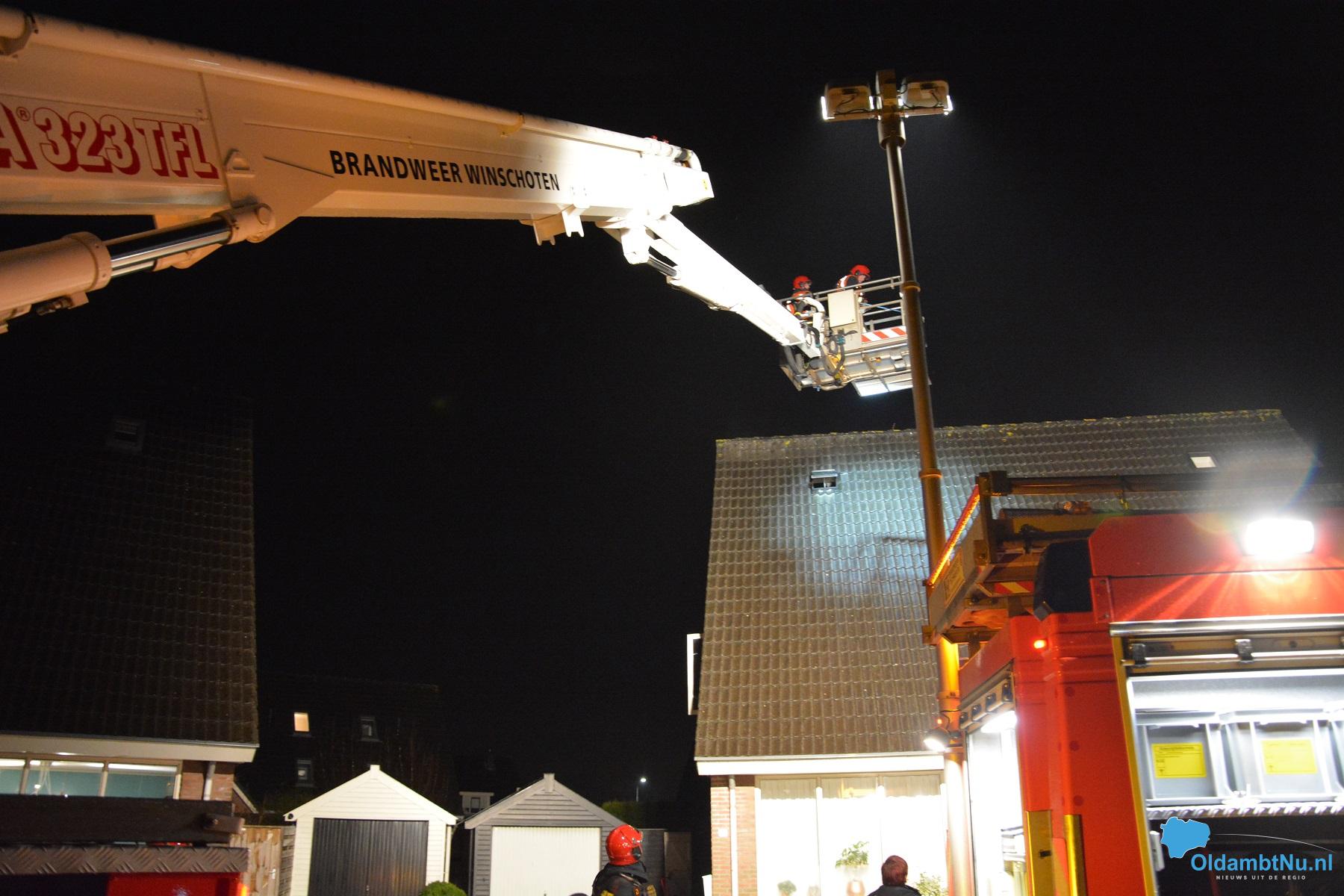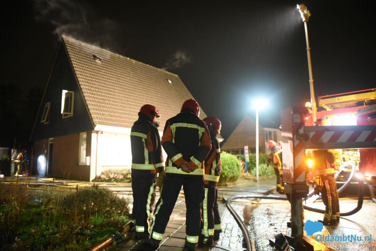 De hoogwerker van Winschoten verleende assistentie om van buitenaf het dak nog te inspecteren en na verwijderen van een aantal pannen daaronder nog te blussen.