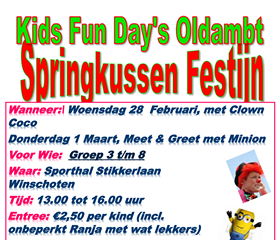 Winschoten – Tijdens de voorjaarsvakantie wordt er een springkussenfestijn georganiseerd op 28 februari en 1 maart in de sporthal aan de Stikkerlaan in Winschoten van 13.00 tot 16.00 uur. De entree bedraagt € 2,50 per kind met onbeperkt ranja en wat lekkers.
