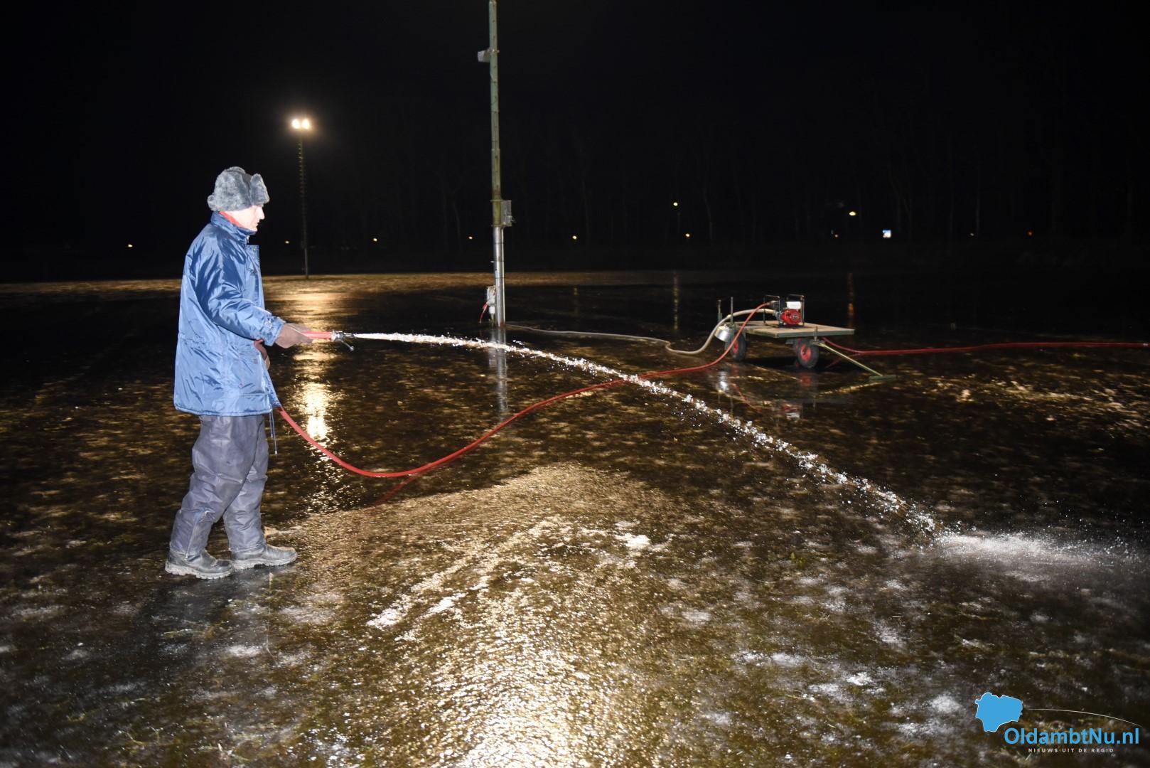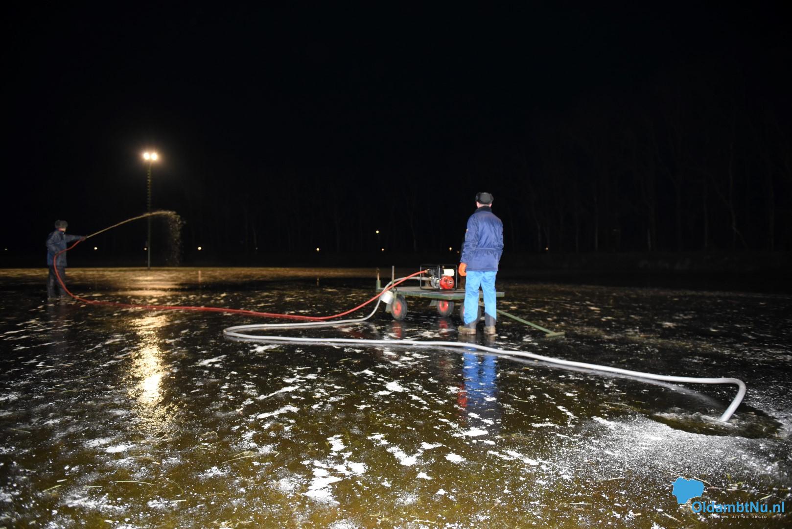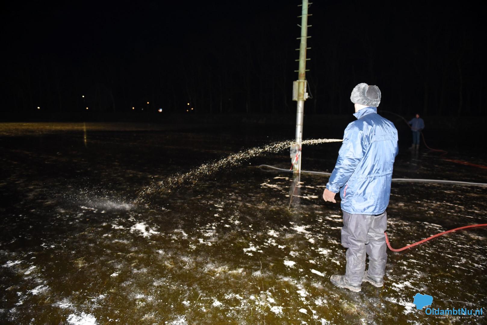 Gewapend met een pomp op een kar en brandweerslangen in de hand gingen de ijsmeesters woensdagavond het ijs op. ‘We doen er alles aan om goede kwaliteit ijs te leveren’ vertelt Bert Hoogstraten namens de vereniging. ‘We halen met de pomp water onder het ijs vandaan, dit spuiten we boven op het ijs, zo kunnen we de scheuren in het ijs prepareren’ aldus Hoogstraten. ‘We hopen hiermee een nette en gladde maar vooral stevige baan te creëren.’