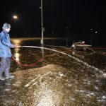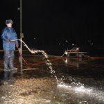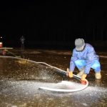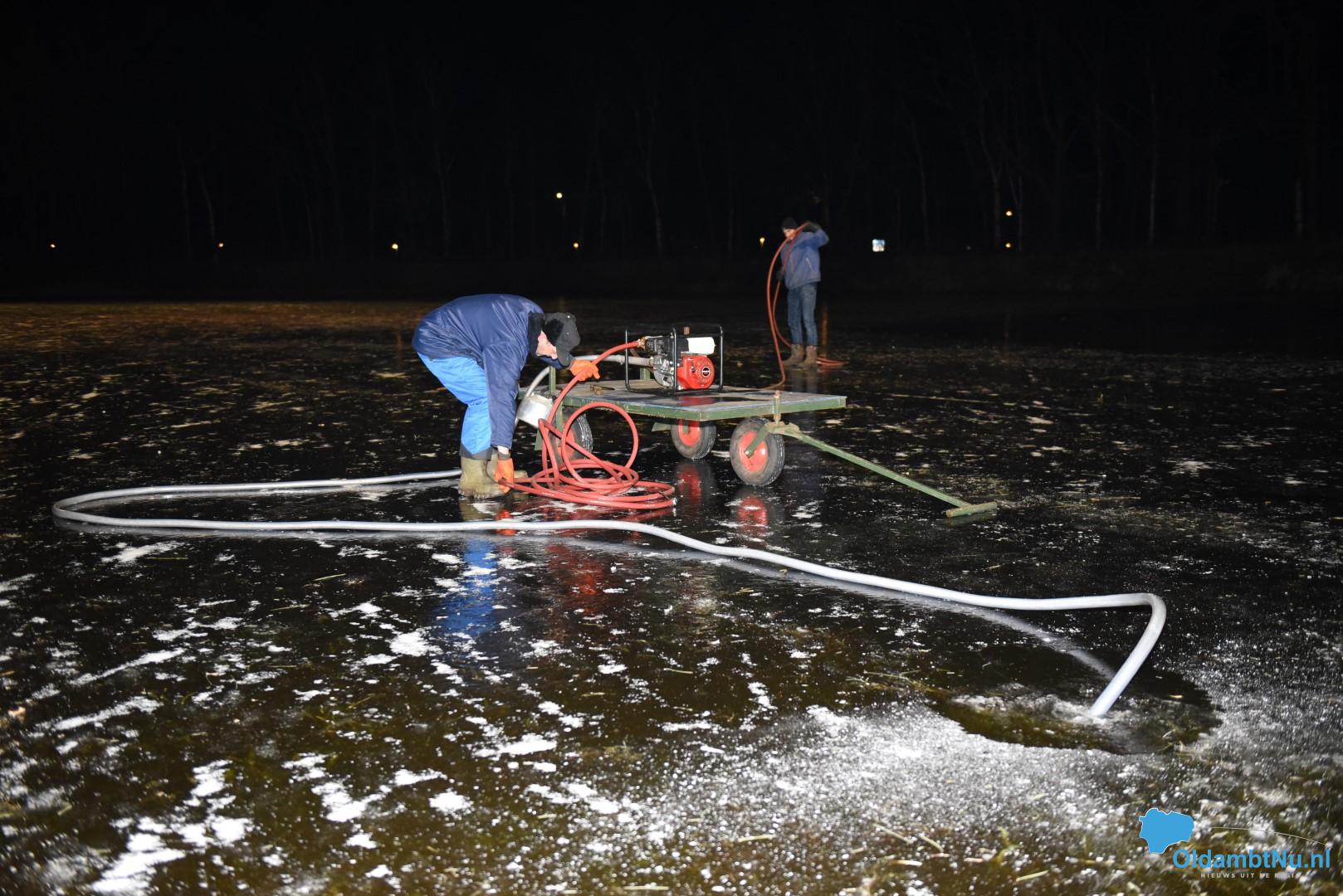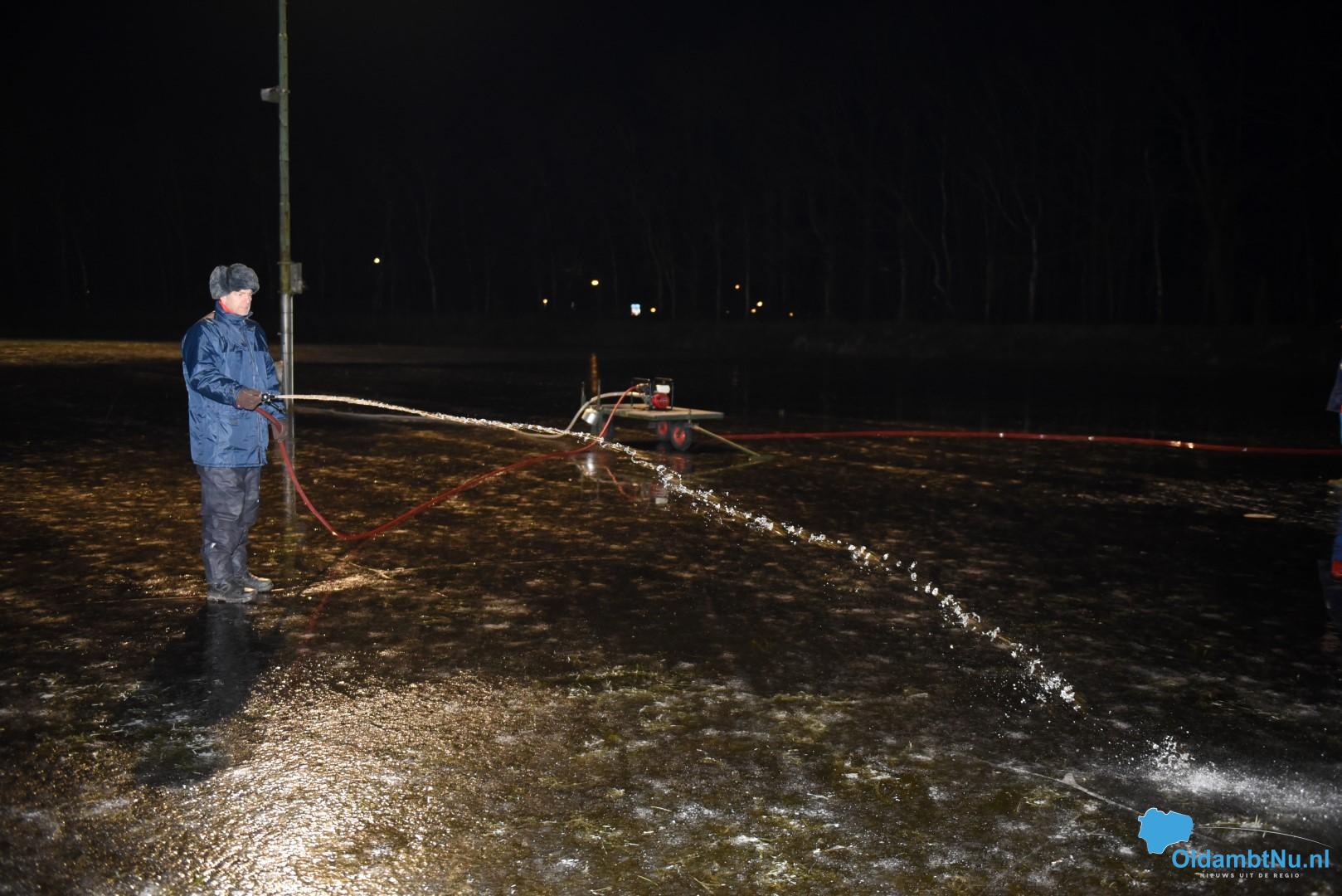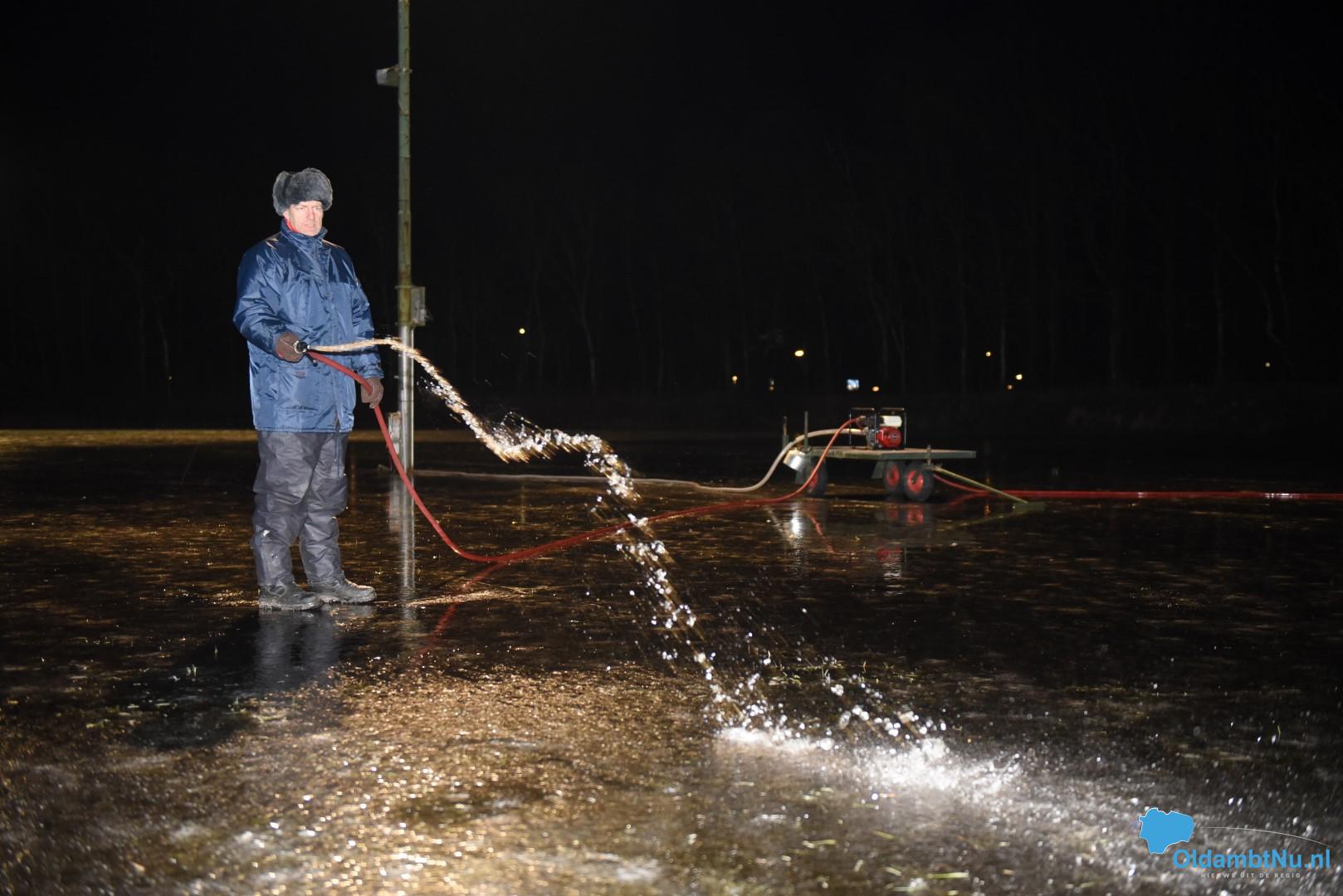 Gewapend met een pomp op een kar en brandweerslangen in de hand gingen de ijsmeesters woensdagavond het ijs op. ‘We doen er alles aan om goede kwaliteit ijs te leveren’ vertelt Bert Hoogstraten namens de vereniging. ‘We halen met de pomp water onder het ijs vandaan, dit spuiten we boven op het ijs, zo kunnen we de scheuren in het ijs prepareren’ aldus Hoogstraten. ‘We hopen hiermee een nette en gladde maar vooral stevige baan te creëren.’