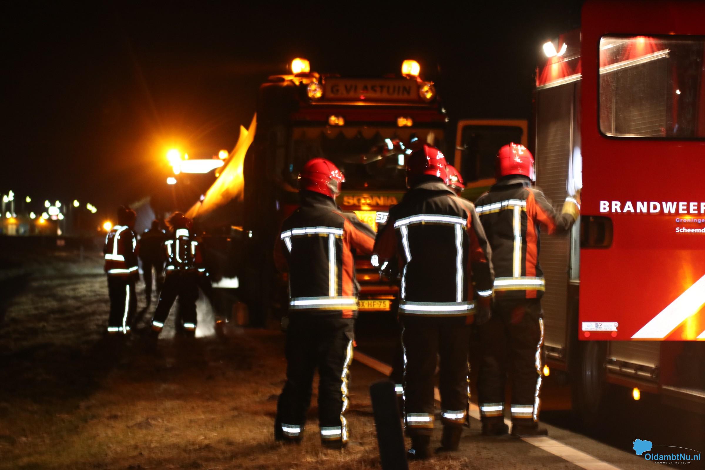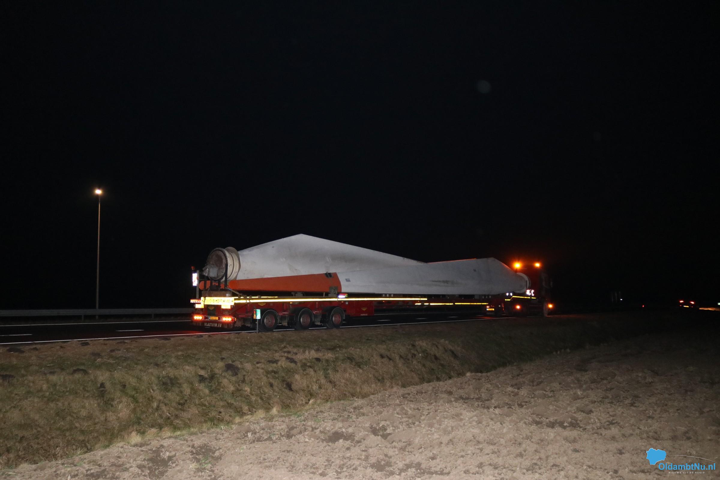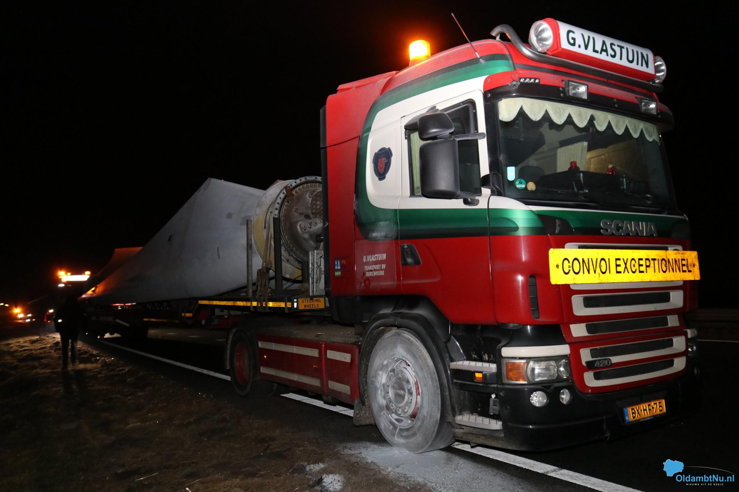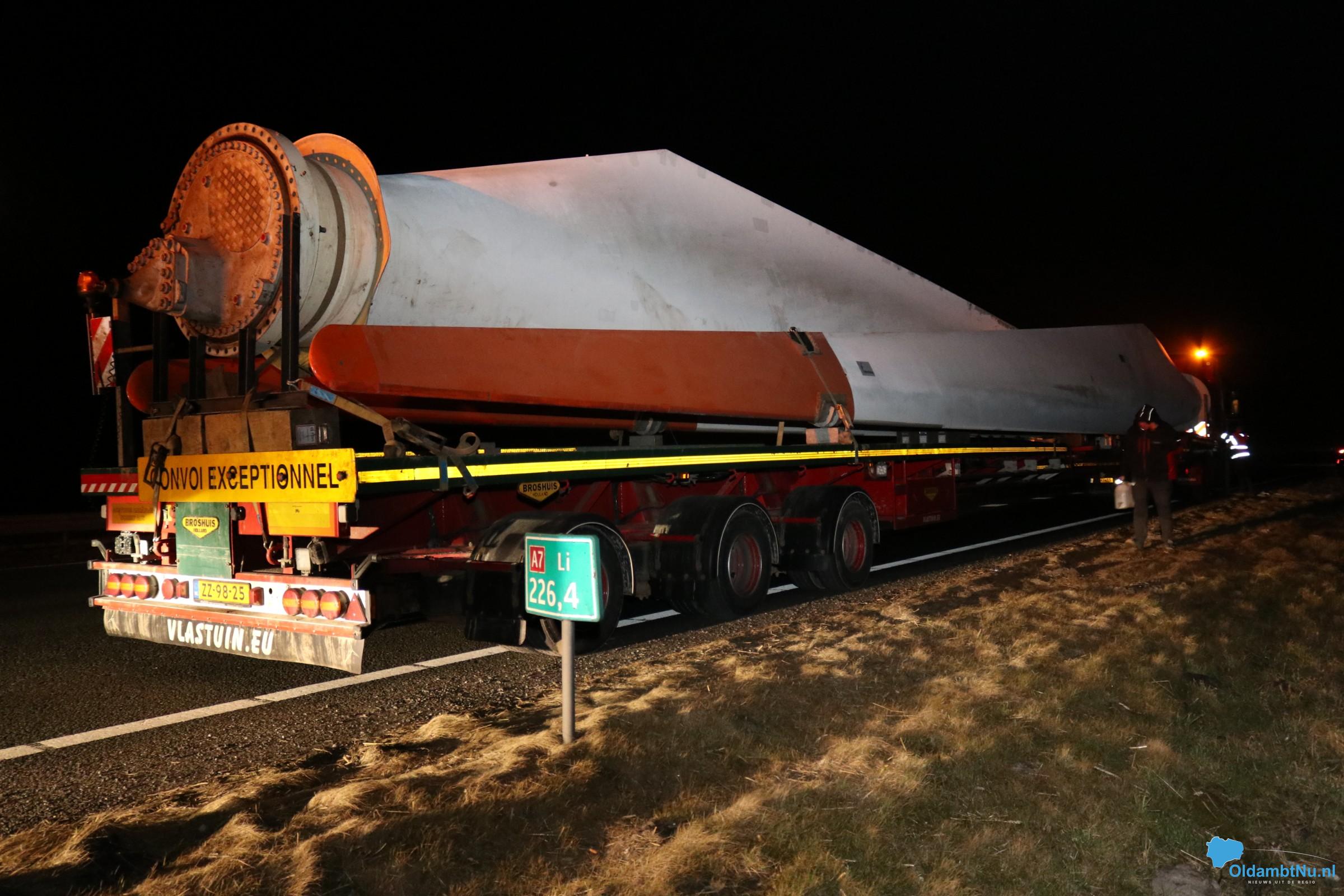 Het bijzonder transport met windmolen onderdelen was sinds 22:00 onderweg in de richting van Friesland. Na een kleine controle kon de vrachtwagen zijn weg vervolgen. Rijkswaterstaat zorgde voor de verkeersveiligheid. Bij het incident zijn geen gewonden gevallen.