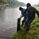 Zaterdagochtend zijn ze begonnen met de ‘bak’ te vullen. Dit wordt gedaan met het water uit het Winschoterdiep. Dit gaat via een sluis die in de dijk is gemaakt. Nu moet de temperatuur de rest doen.