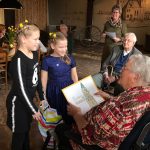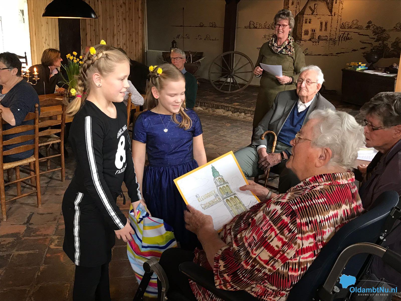 Tijdens de opening vertelde haar dochter Riekje Barlagen-Geertsema iets over het leven van haar moeder en het plezier dat ze altijd in het schilderen heeft gehad. Haar achterkleindochters Esmee (9) en Mara (6) mochten vervolgens, door het aan doen van het licht boven de schilderijen, de expositie openen. Zij gaven hun overgrootmoeder nog een mooi kleurboek met onder andere de Martinitoren.