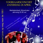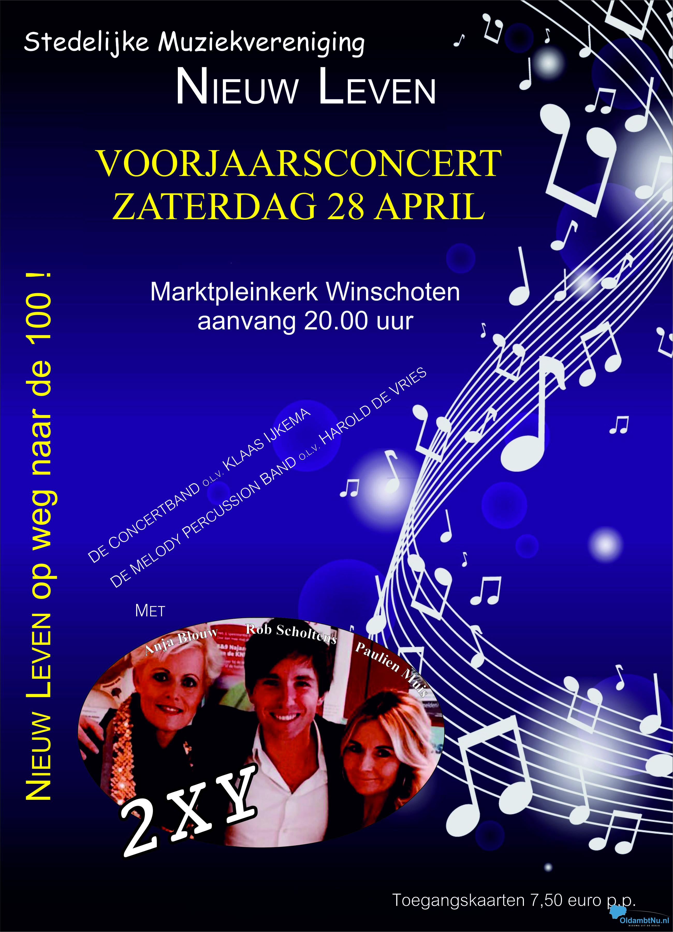 Op zaterdag 28 april 2018 geeft Nieuw Leven een voorjaarsconcert in de Marktpleinkerk in Winschoten. Hierbij zullen zowel de Concertband als de Melody Percussion Band van zich laten horen. Dit doen wij niet alleen. Zanger Rob Scholtens (bekend van Alloway), zangeres Paulien Muis en zangeres Anja Blouw zullen een aantal nummers onder begeleiding van Nieuw Leven zingen. Samen vormen zij 2XY en zullen zelf ook een aantal bekende nummers zingen. De presentatie van de avond is in handen van Erik Blaauw.