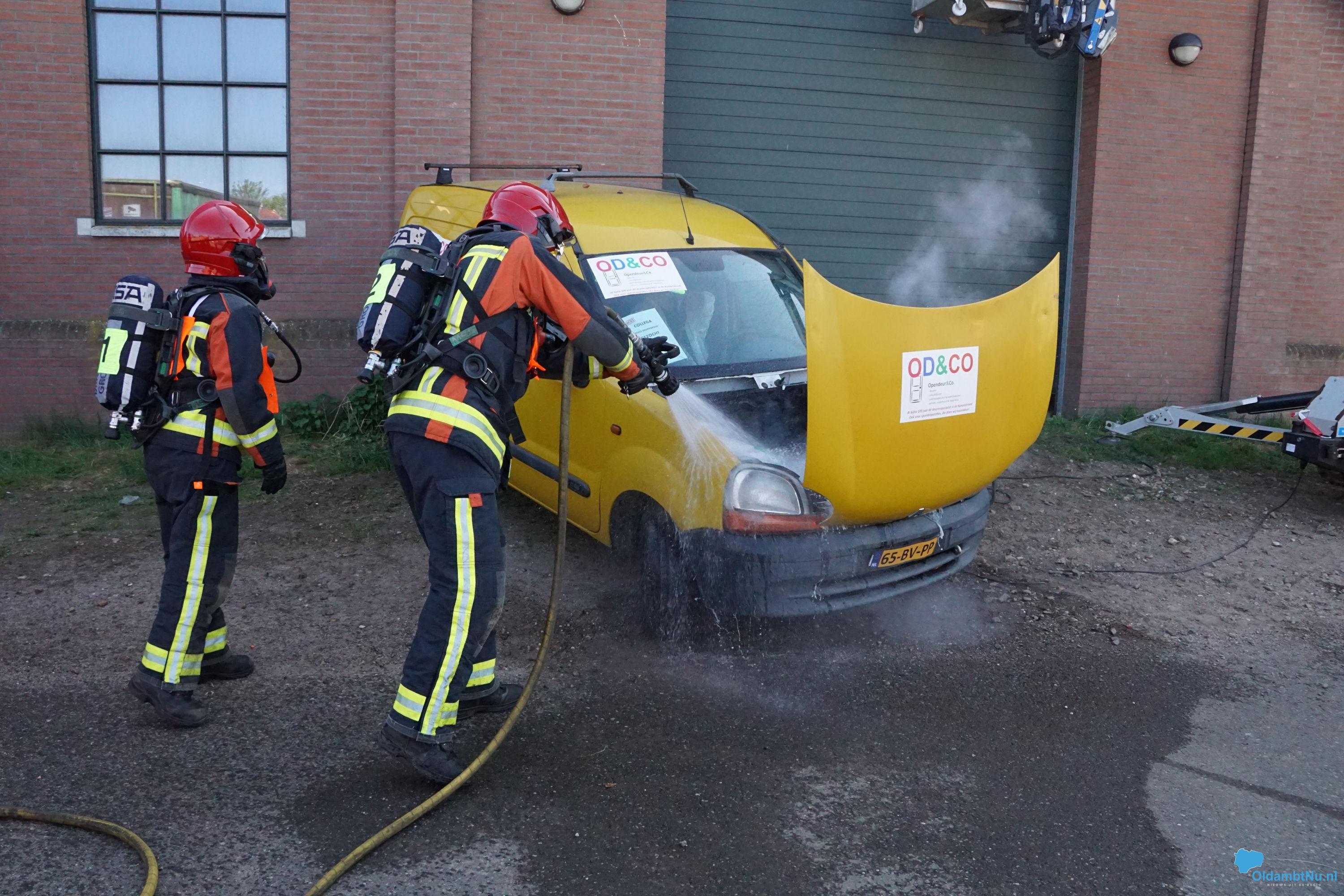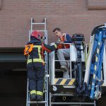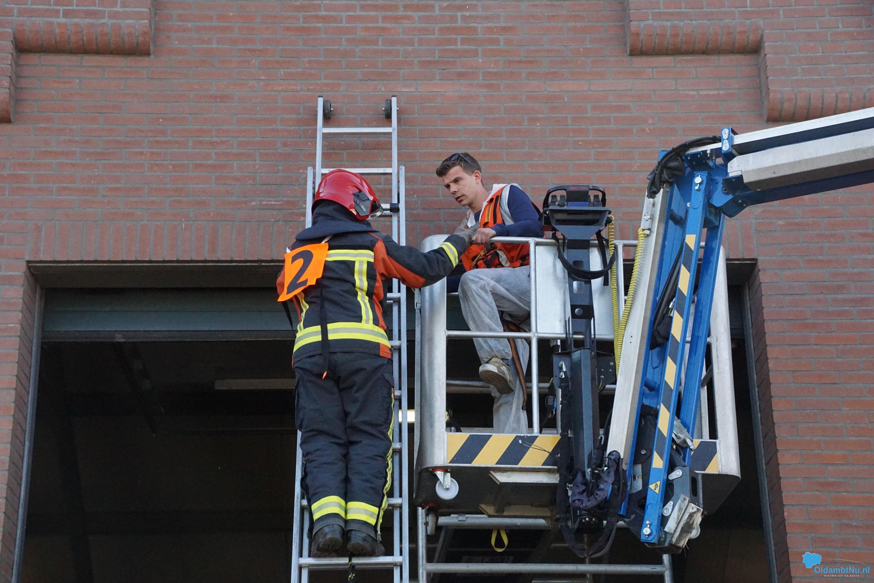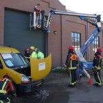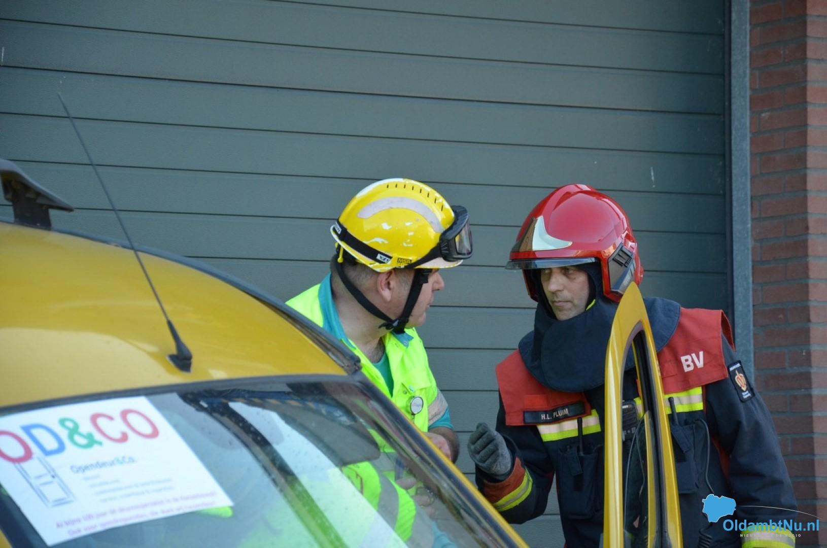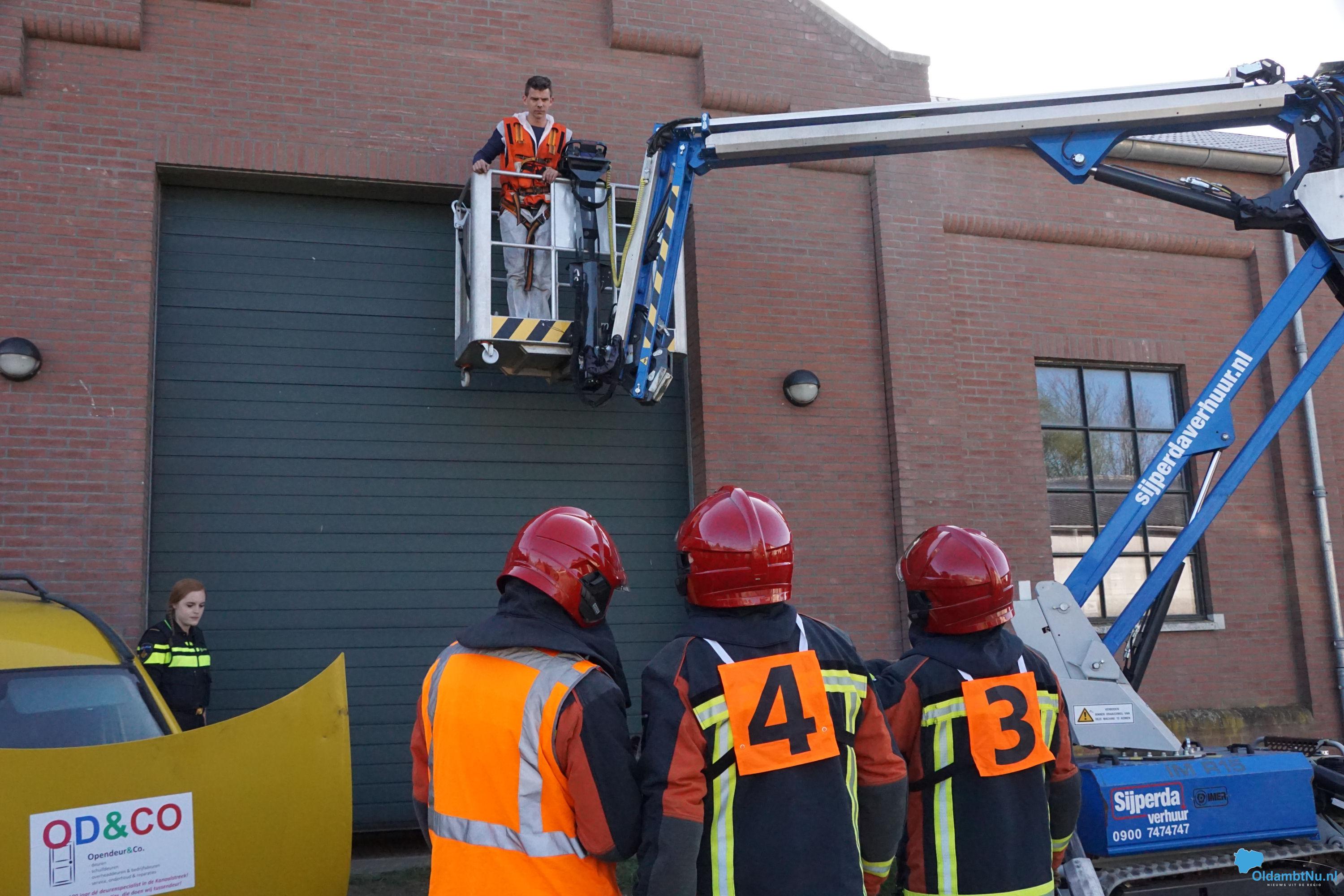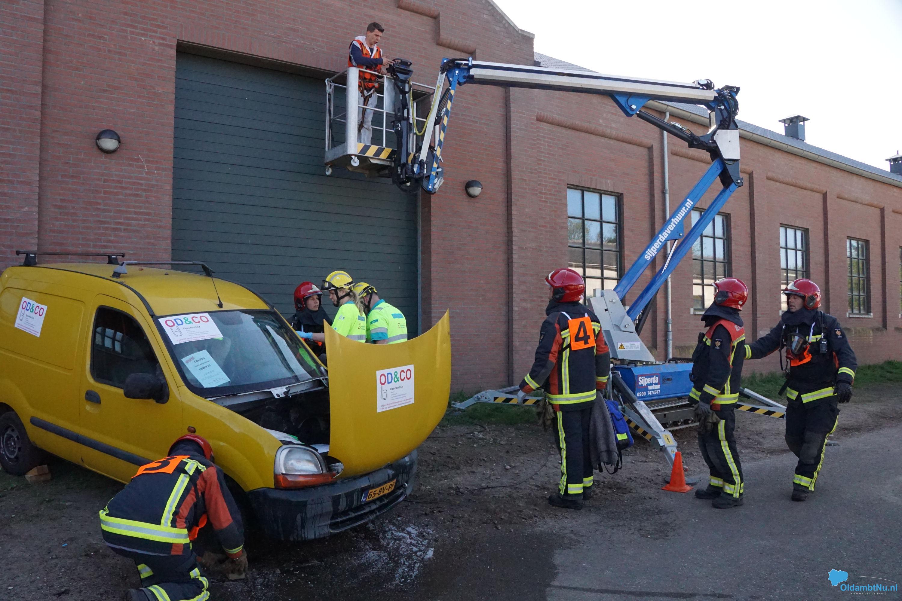 Bij een ongeluk is een bestelbus tegen een hoogwerker aangebotst. De auto vloog in brand. De hoogwerker, met persoon bovenin, is tegen de roldeur aangeschoven. De hoogwerker wilde na de klap niet meer naar beneden.