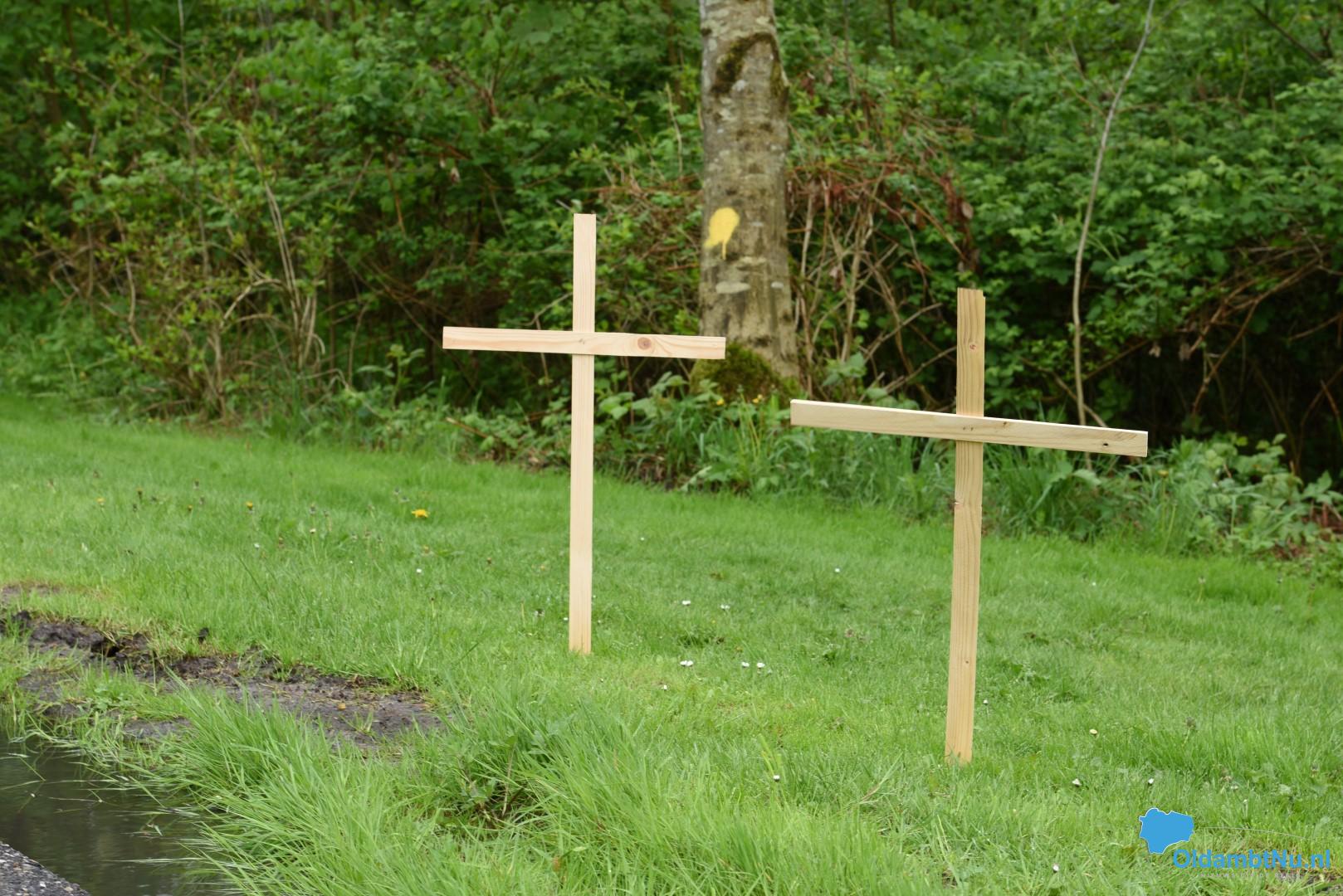 Bad Nieuweschans – Wie vandaag Bad Nieuweschans binnenrijdt via de Oudezijl, rijdt langs een luguber tafereeltje. In de berm zijn door een onbekende twee houten kruisen neergezet.