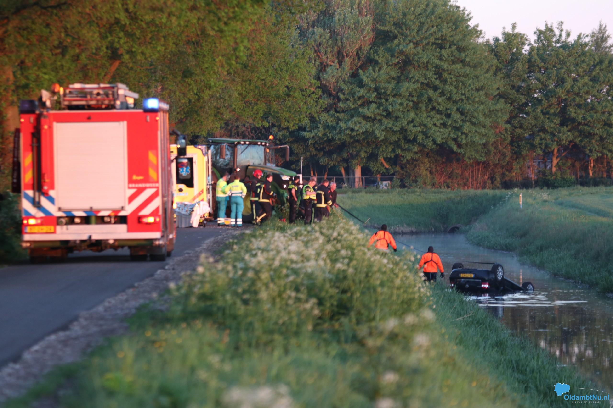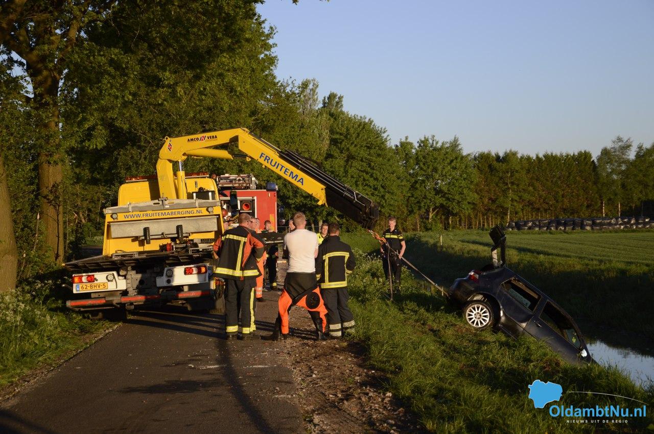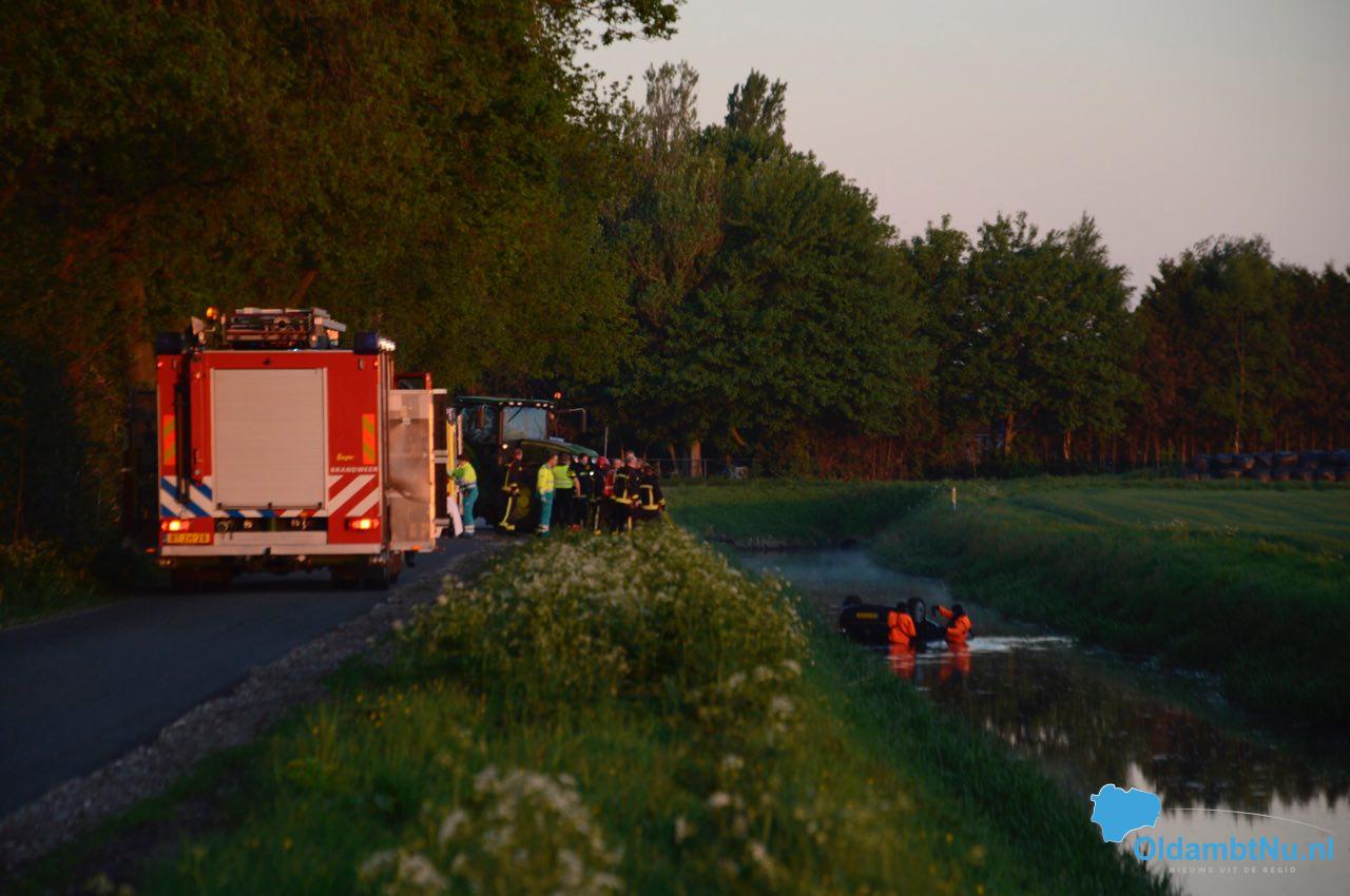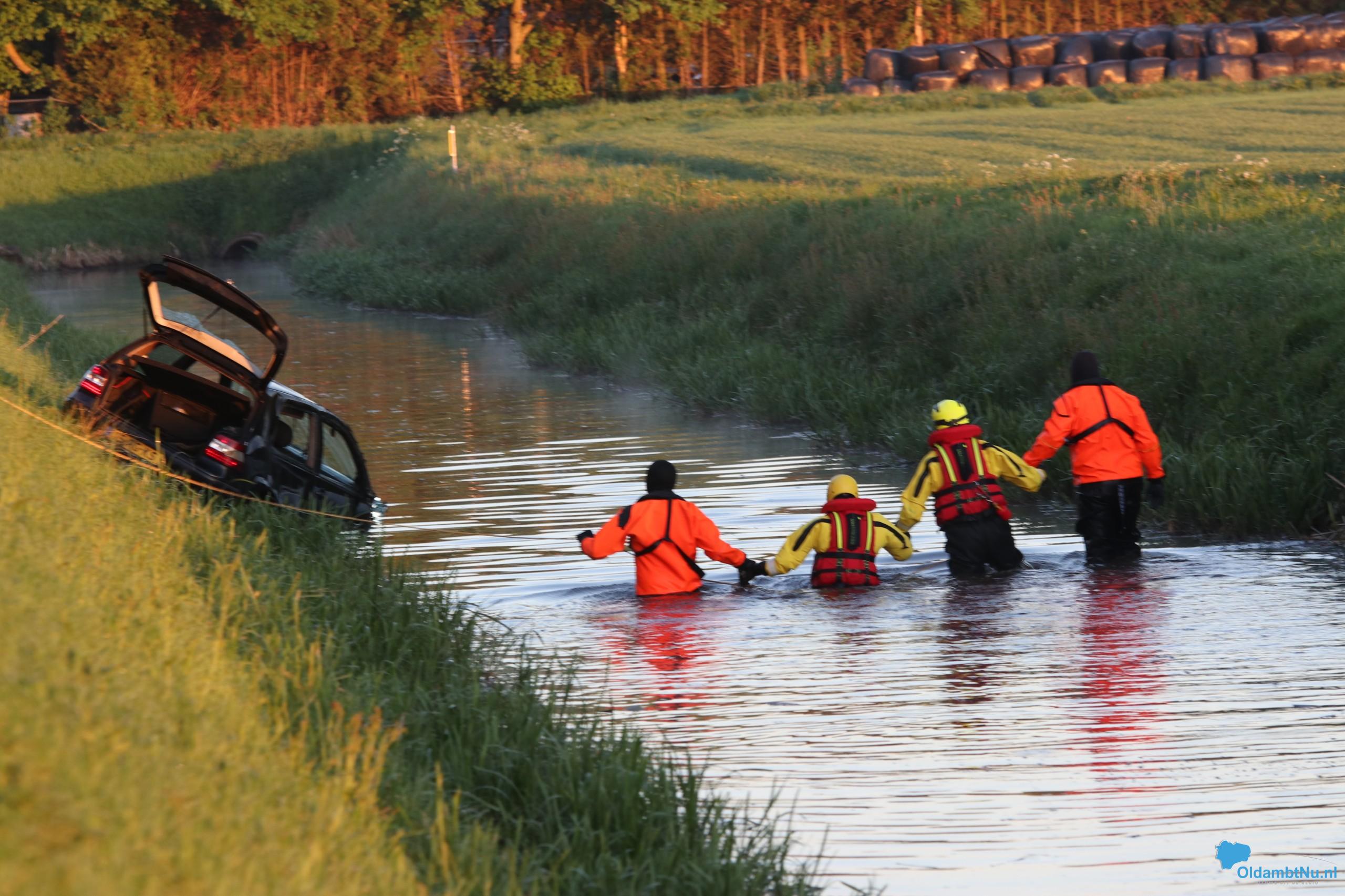 Een zwarte auto lag op de kop in het water, een boer heeft deze ontdekt. De brandweer heeft in samenwerking met de boer de auto omgetrokken, zij troffen niemand aan in het voertuig of in het water.