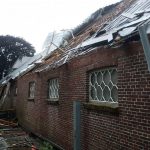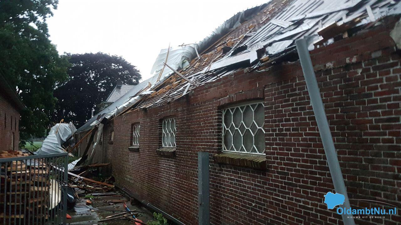 Oldambt – Het onweer boven Oldambt is nu in alle hevigheid losgebarsten. Bij speelboerderij De Leeuwenborg in Nieuw Scheemda is omstreeks 18:15 uur het dak eraf gewaaid.