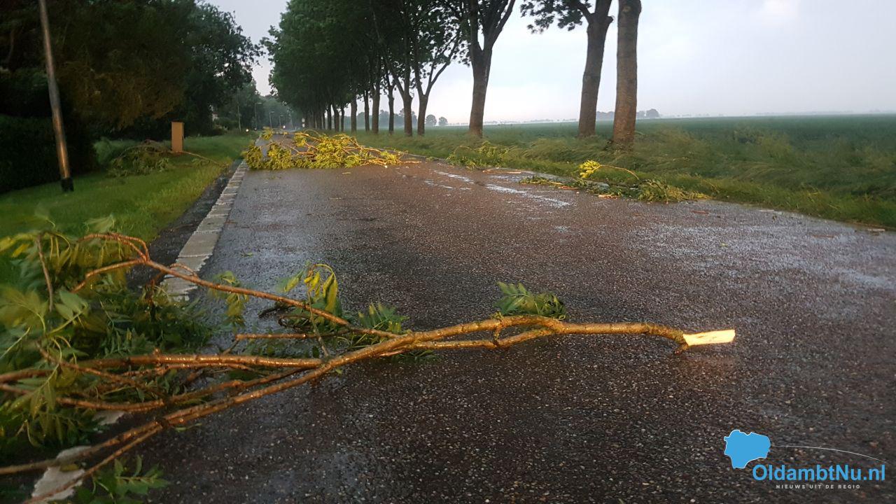 Stormschades Oldambt: Dak van de schuur, takken op de weg