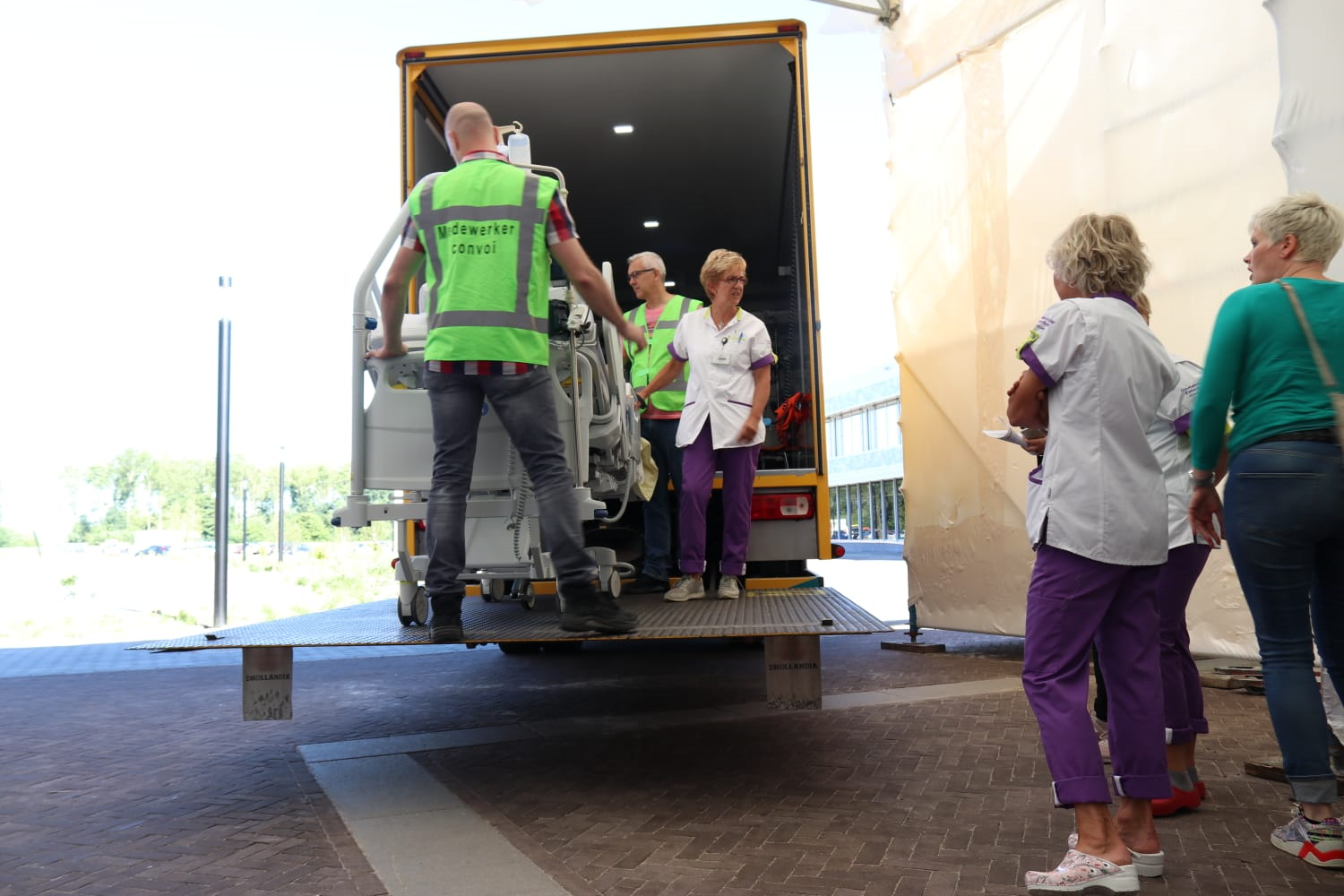 09:15 uur: Zo zien de vrachtwagens waarmee de patiënten worden vervoerd eruit. In de vrachtwagen zijn schermen aanwezig, zodat de patiënten kunnen zien waar men rijdt.