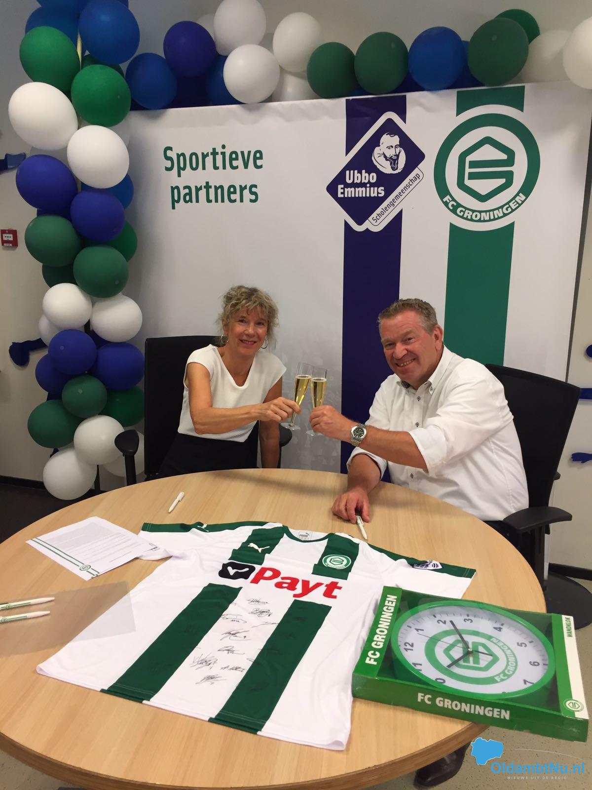 Winschoten – Het samenwerkingsverband tussen FC Groningen en Ubbo Emmius Winschoten is afgelopen maandagmiddag verlengd met 1 jaar. FC Groningen directeur Nijland was zelf aanwezig op school om samen met toekomstig directeur van Ubbo Emmius Winschoten, mevrouw Buiter, hun handtekeningen onder het samenwerkingscontract te zetten.