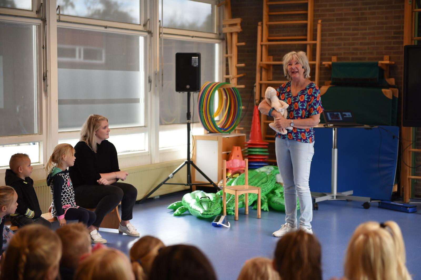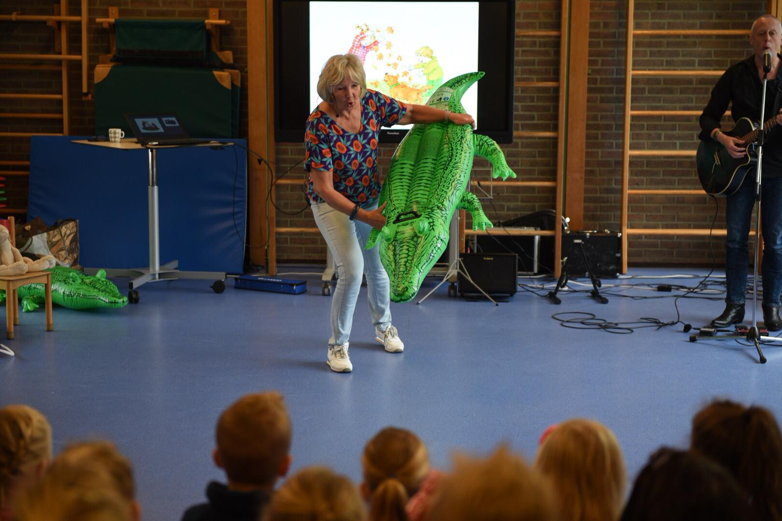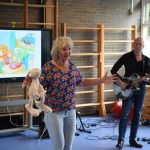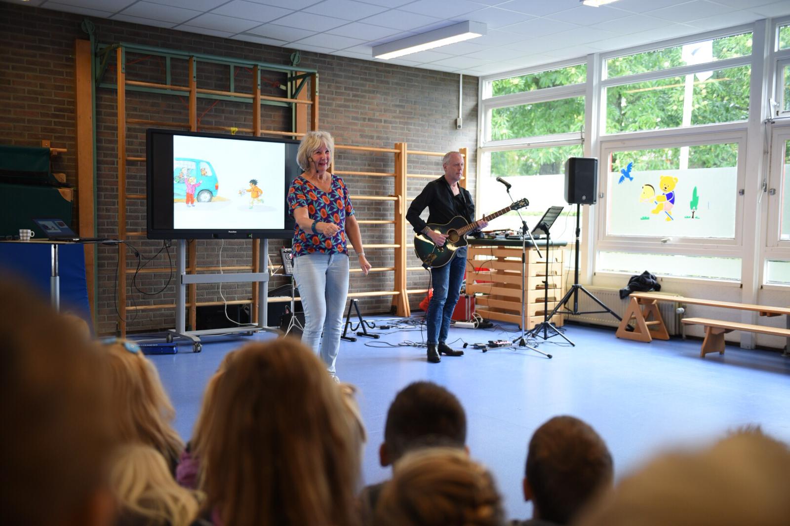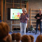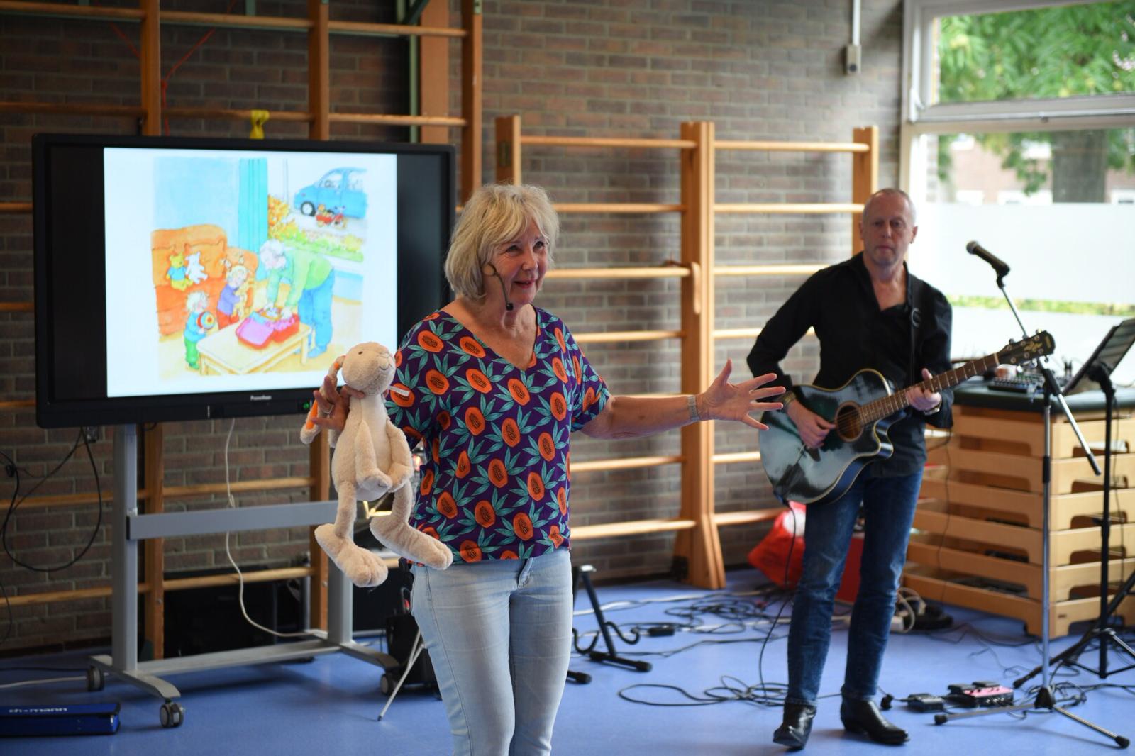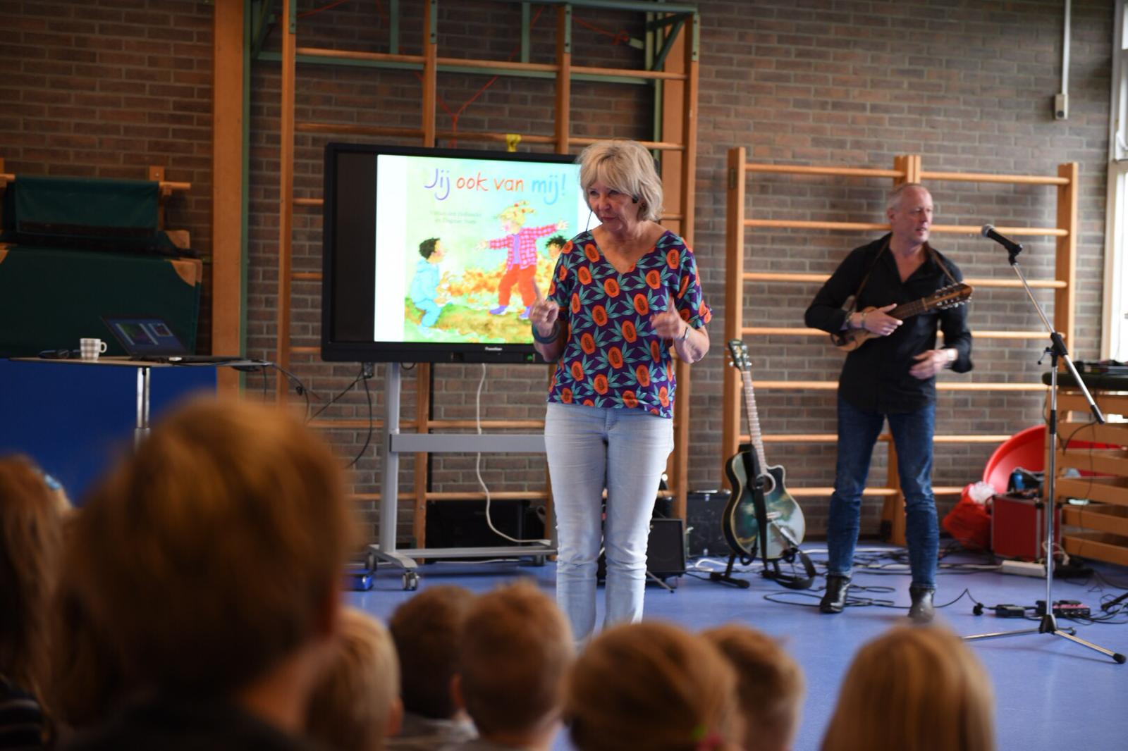 Vivian den Hollander vertelde en Mattie Poels begeleidde haar op diverse instrumenten. Gezongen werd er natuurlijk ook, de kinderen hadden vooraf goed geoefend met het vriendenlied. Vanaf nu wordt er op OBS Beukenlaan vast nóg meer uit de boeken van Vivian den Hollander gelezen.