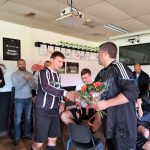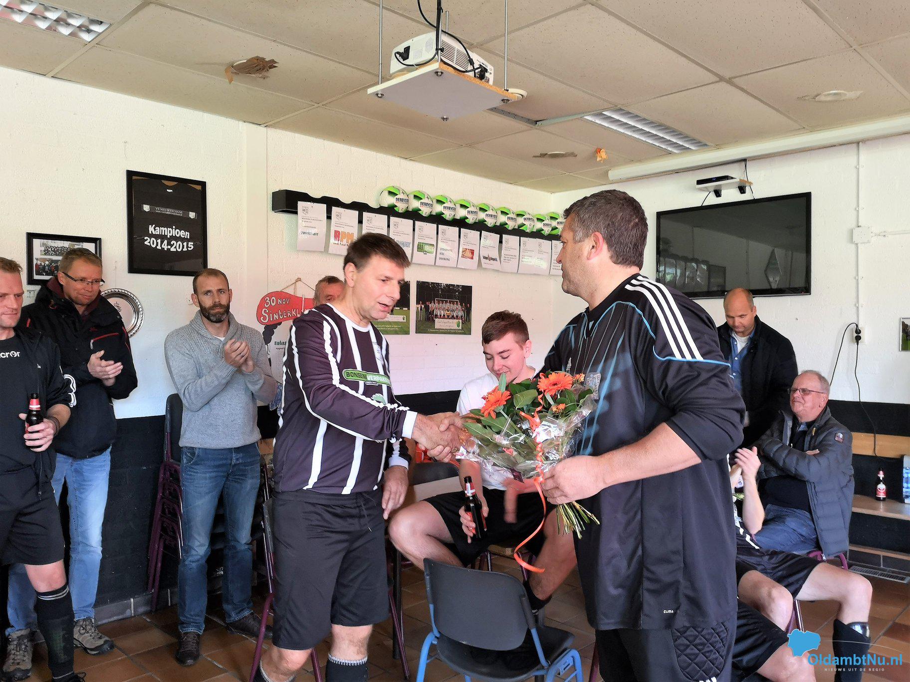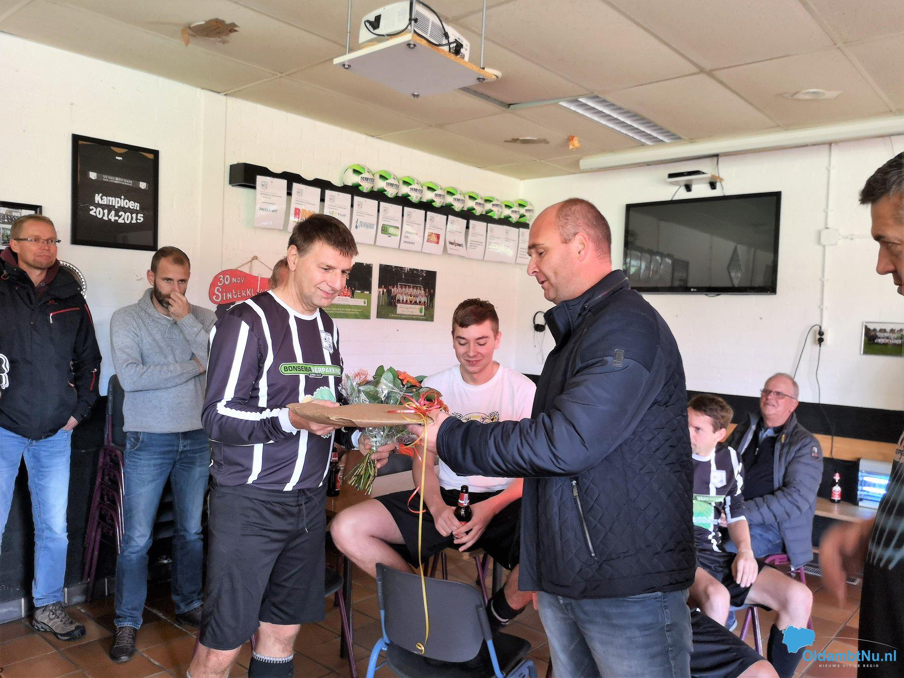 Hij is zo’n 40 jaar actief amateurvoetballer geweest en nu is het voor hem genoeg geweest. Enzo Leeuwerke heeft na afloop van de wedstrijd een kleine toespraak gehouden om hem te danken voor alles wat hij voor de club heeft betekend. Ook kreeg hij een blijvende herinnering, een klok glasgravure met het logo van VV Nieuweschans en een bos bloemen.