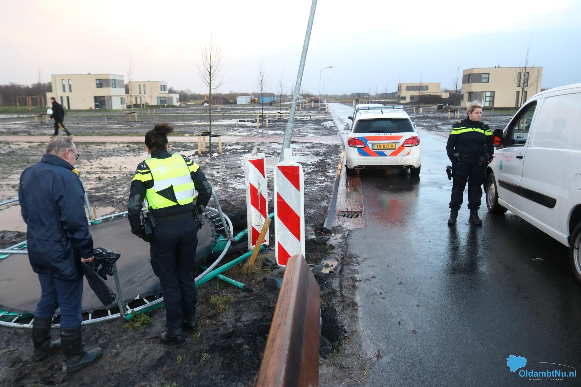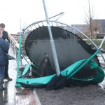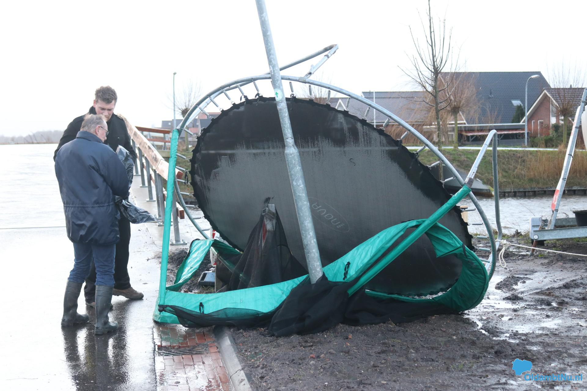 Niet veel later vloog een trampoline richting een woning in de Blauwestad, alerte buurtbewoners hadden adequaat gereageerd en het gevaarte vastgebonden. Ook de politie hielp hierbij een handje.