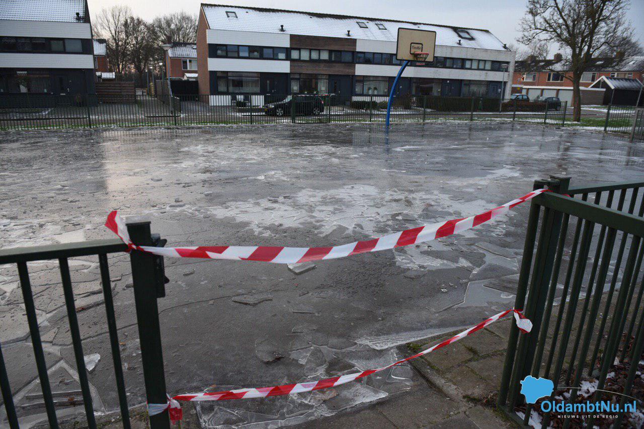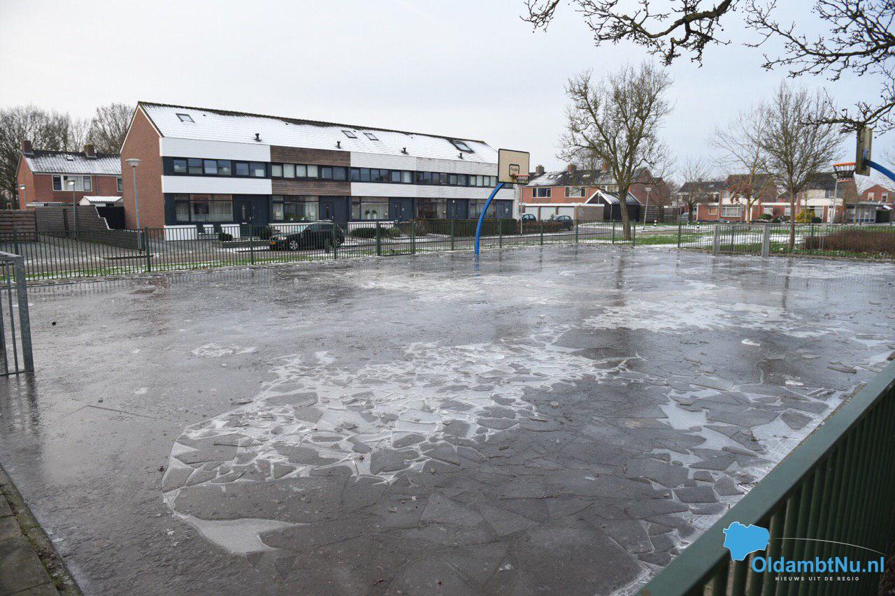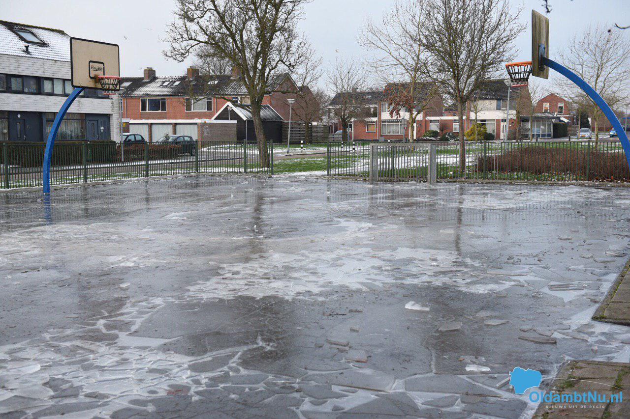 De gemeente Oldambt heeft Van der Flier deze opdracht gegeven. Helaas is de ijsbaan die bijna voldoende dikte had afgelopen zondag slachtoffer geworden van vandalisme.